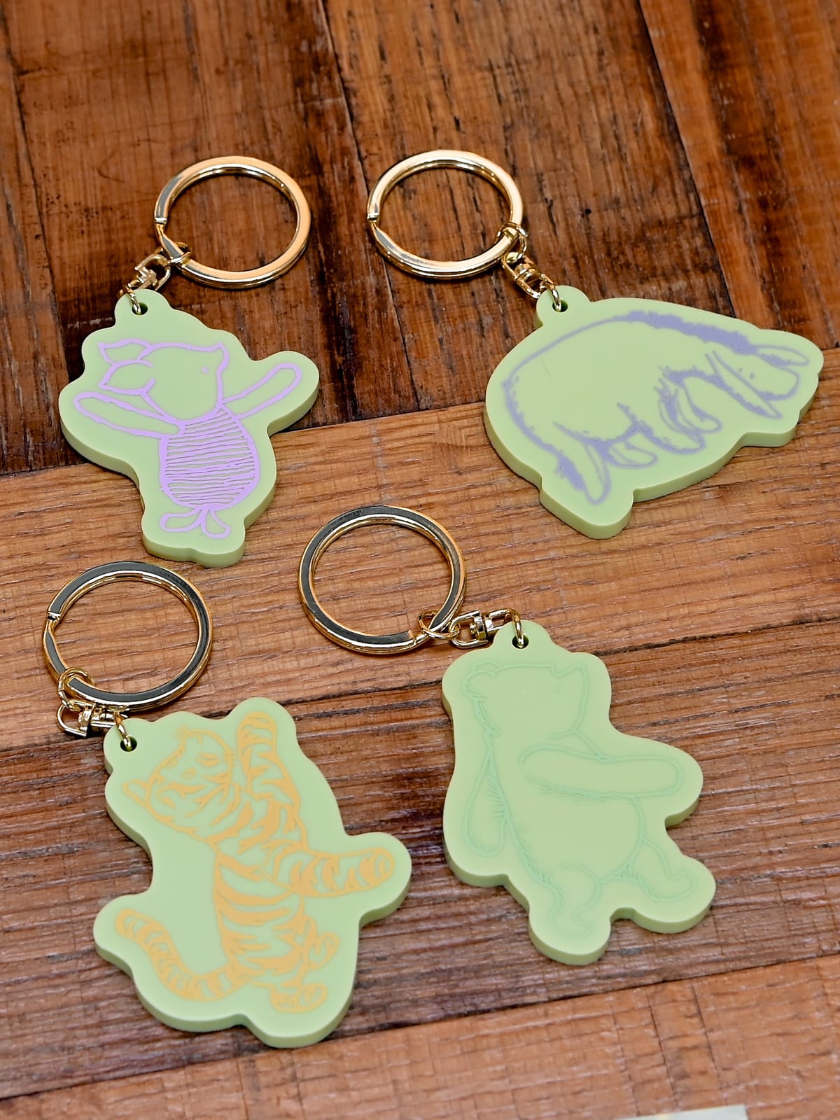 ダイカットデザインがかわいい「プー」、「ピグレット」、「ティガー」、「イーヨー」のキーホルダー。