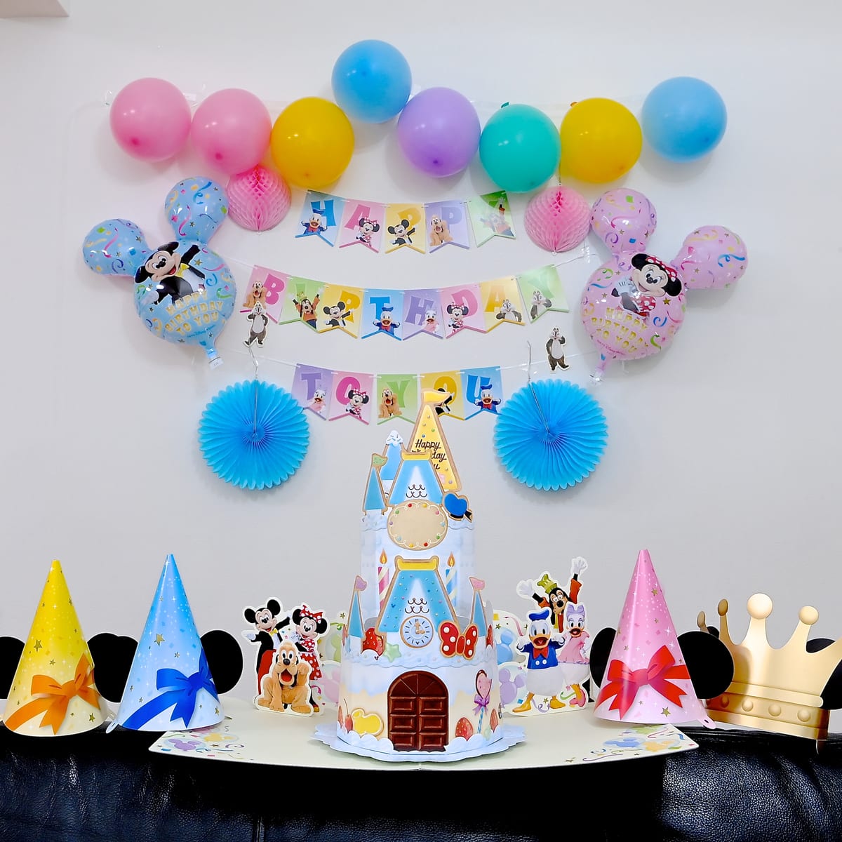 「ミッキー&フレンズ」の実写でデザインされたデコレーショングッズが盛りだくさんのお祝いにぴったりなセットです☆