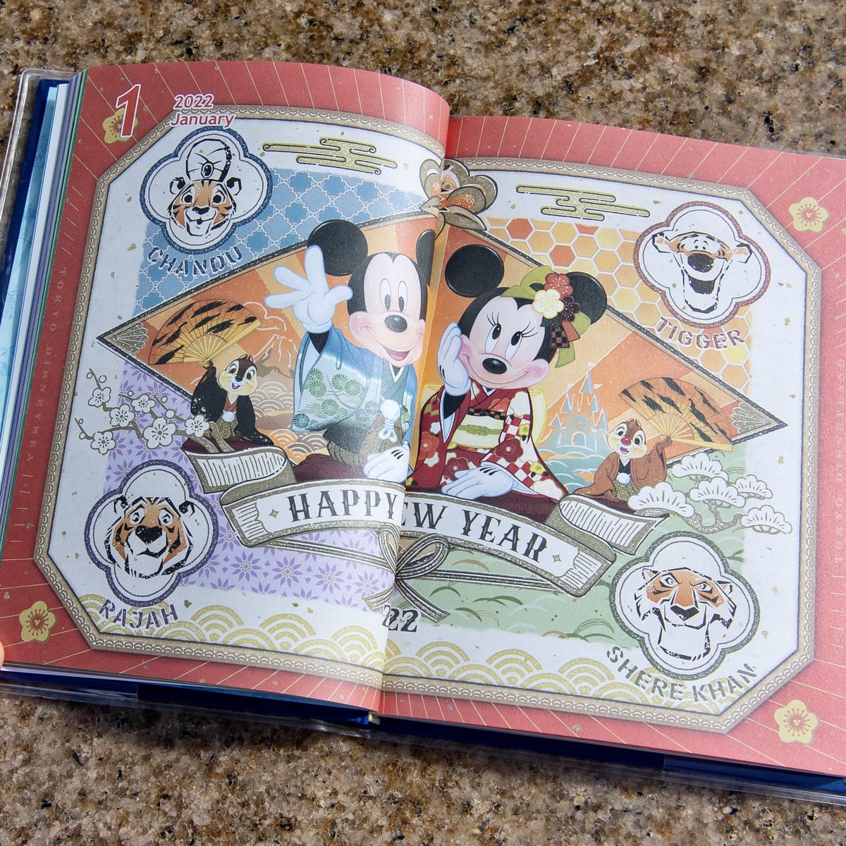 2022年の干支は寅年ということで、1月のアートには、東京ディズニーシーのアトラクション「シンドバッド・ストーリーブック・ヴォヤッジ」に登場する「チャンドゥ」、『アラジン』に登場する「ラジャー」、『くまのプーさん』に登場する「ティガー」、『ジャングル・ブック』に登場する「シア・カーン」がデザインされています。