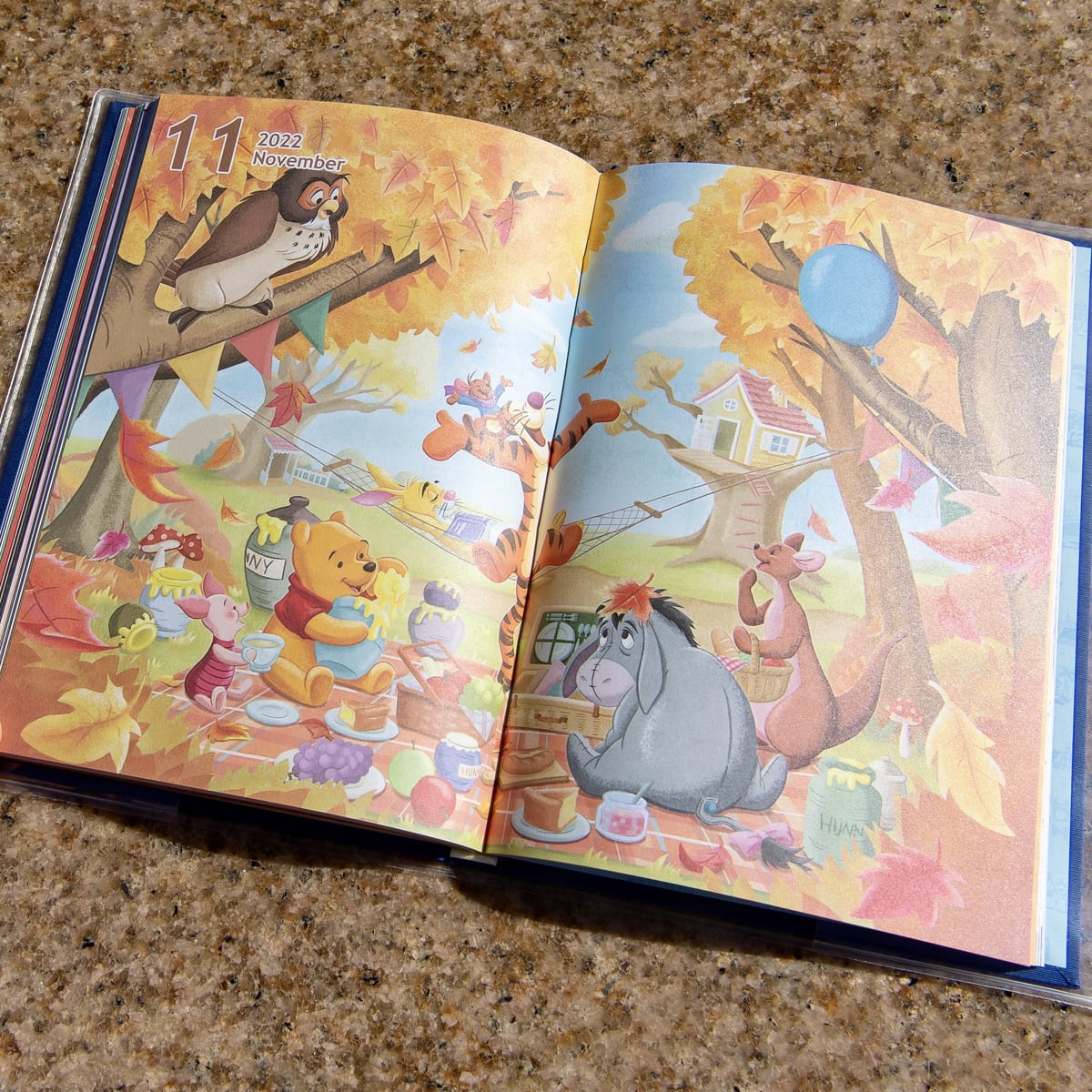 ピクニックをするくまのプーさん、ピグレット、イーヨー、ティガー、カンガ、ルー、オウル、ラビットのアート。