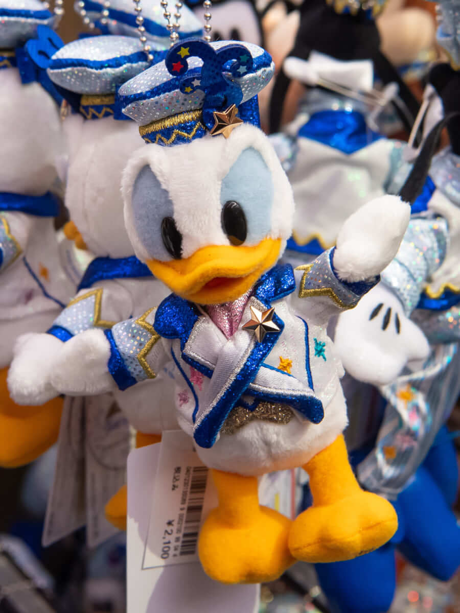 ドナルドダックは、キラキラなジャケットと水兵帽コスチューム。