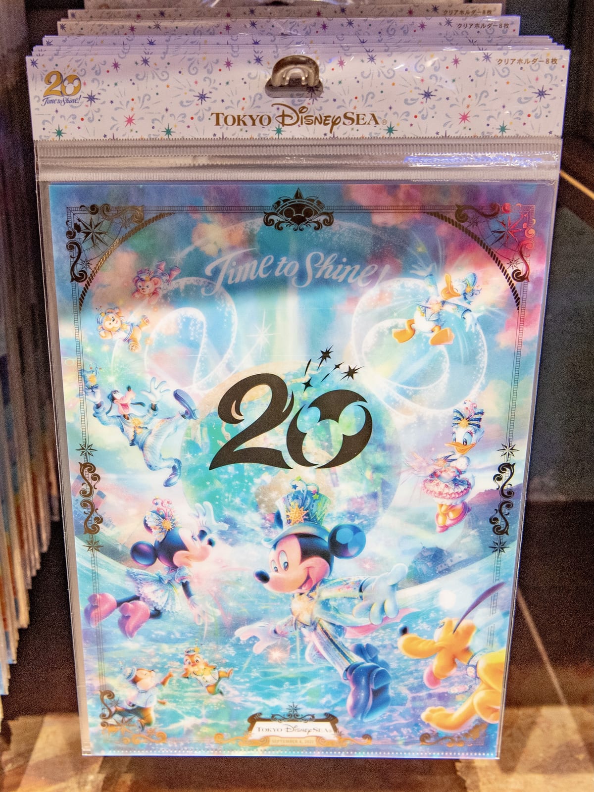 20周年コスチュームのミッキーマウスたちと星がデザインされた箔押しのクリアホルダー8枚セット。