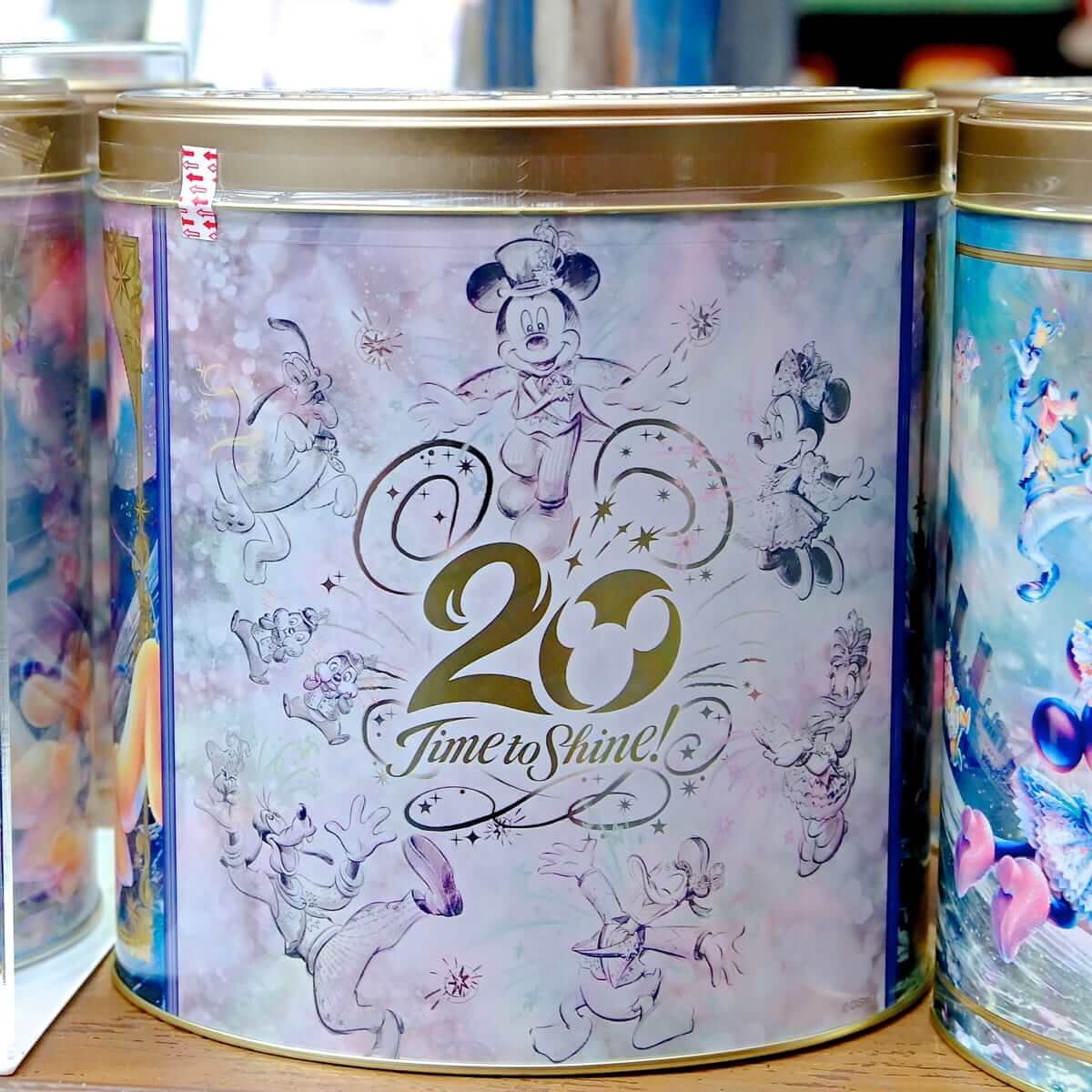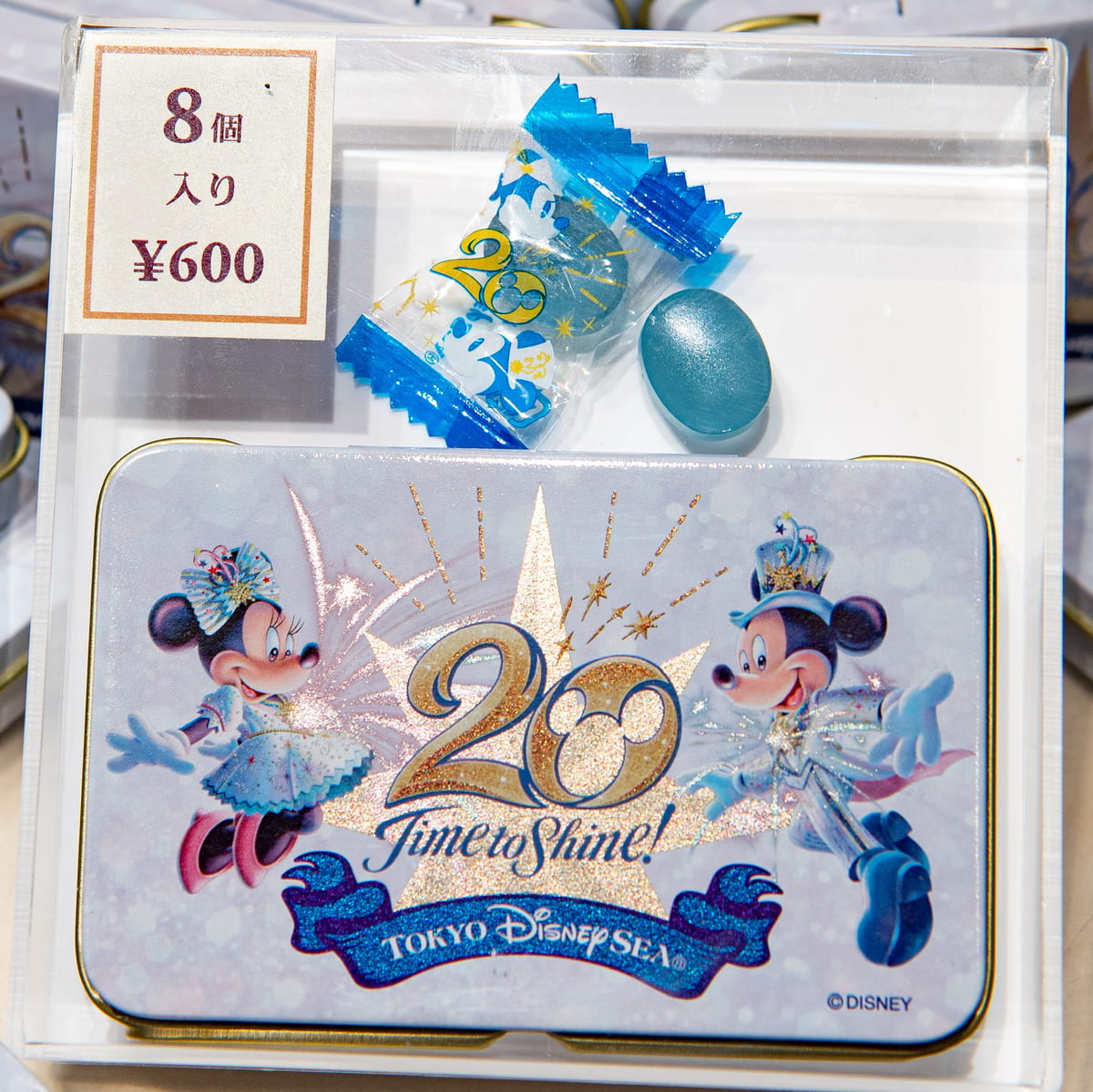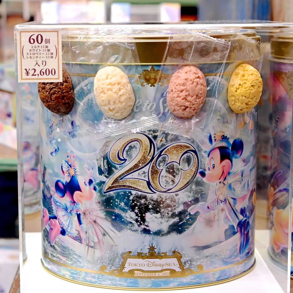東京ディズニーシー20周年のロゴ、ミッキーマウス、ミニーマウスがデザインされた缶入りのキャンディー。