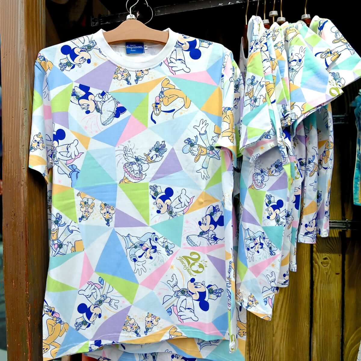 20周年コスチュームのミッキーマウスたちを全面にデザインしたカラフルなTシャツ。