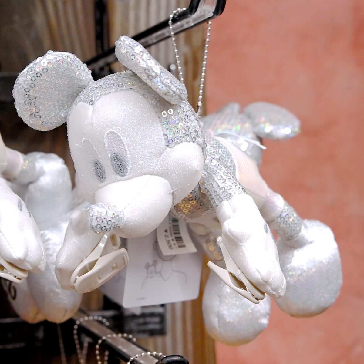キラキラなスパンコールデザインのミッキーくっつきぬいぐるみ。