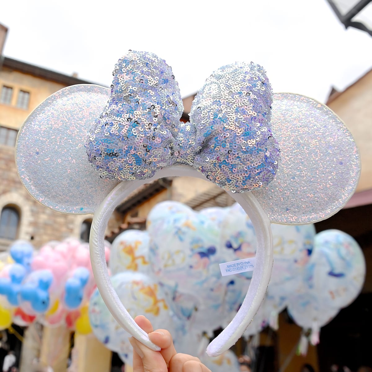 青白く輝くキラキラのラメとスパンコールがデザインされたミニーマウスカチューシャ。