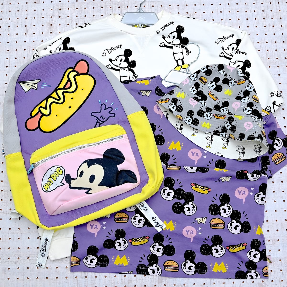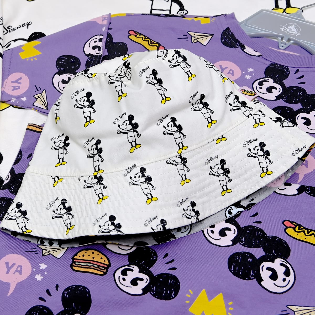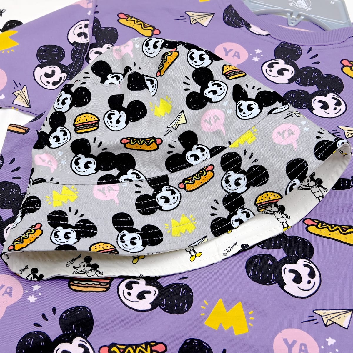 「ミッキーマウス」のかわいいお顔とホットドッグやハンバーガー、紙飛行機のイラストが散りばめられた総柄デザイン。