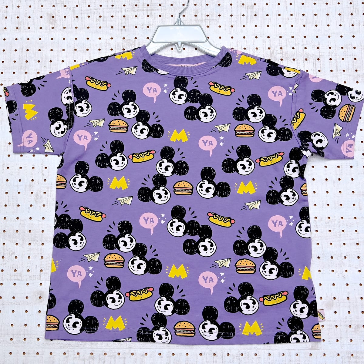 「ミッキーマウス」のお顔とホットドッグやハンバーガー、紙飛行機、“M”、“YA”のイラスト総柄デザイン。