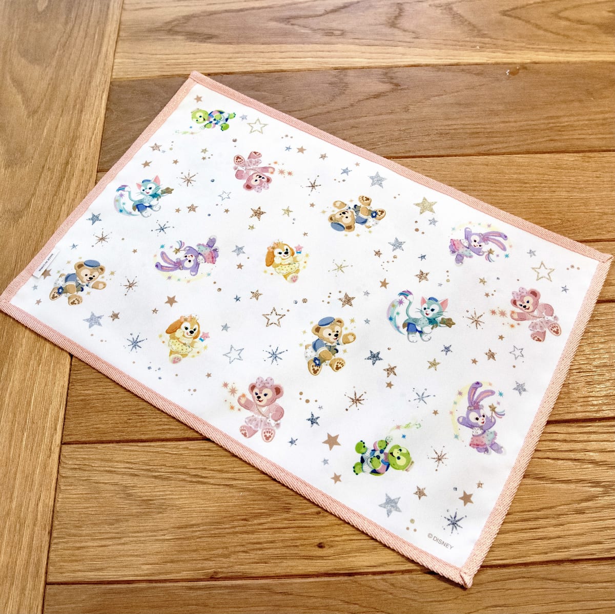 「ダッフィー」、「シェリーメイ」、「ジェラトーニ」、「ステラ・ルー」、「クッキー・アン」、「オル・メル」と輝く星がデザインされたパステルカラーのランチョンマット。