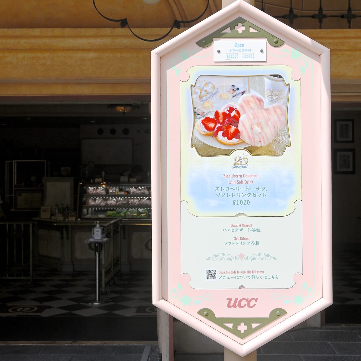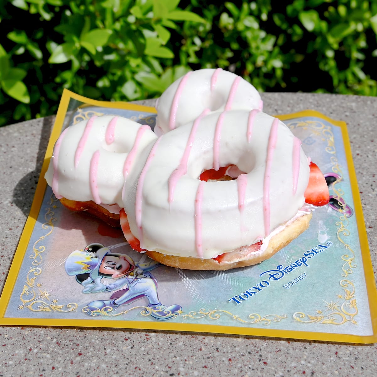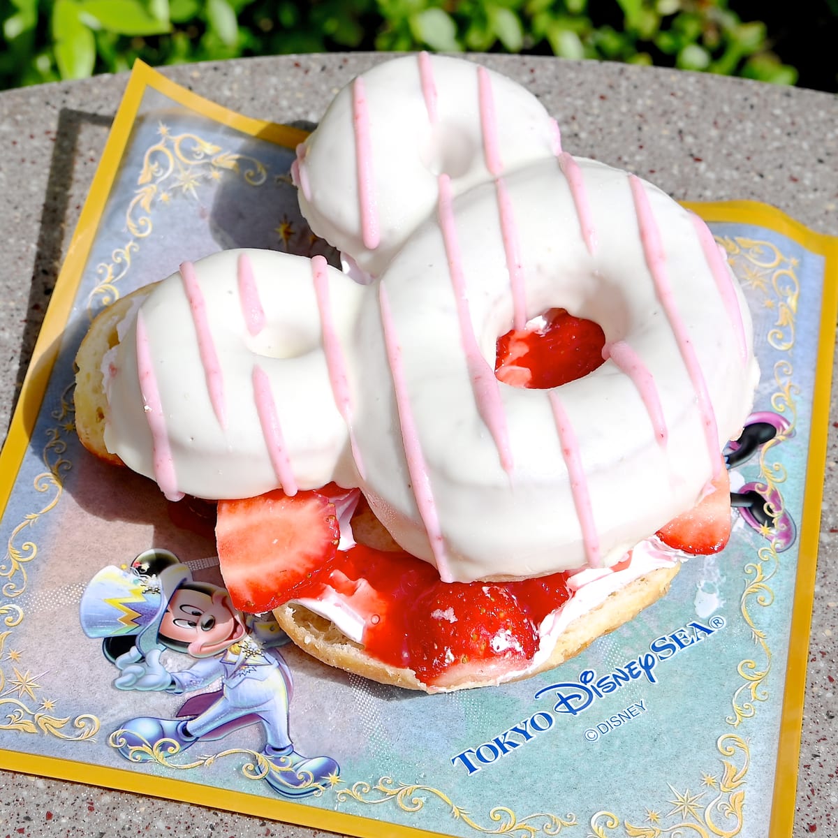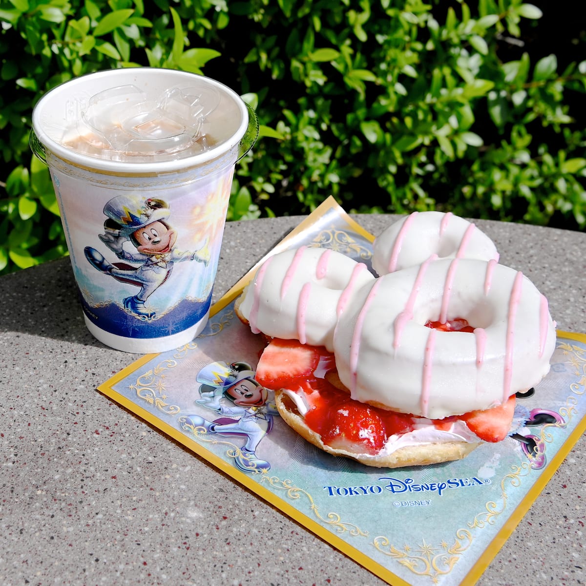 ミッキーマウス形のドーナツ!東京ディズニーシー20周年ストロベリードーナツ、ソフトドリンクセットの紹介でした。