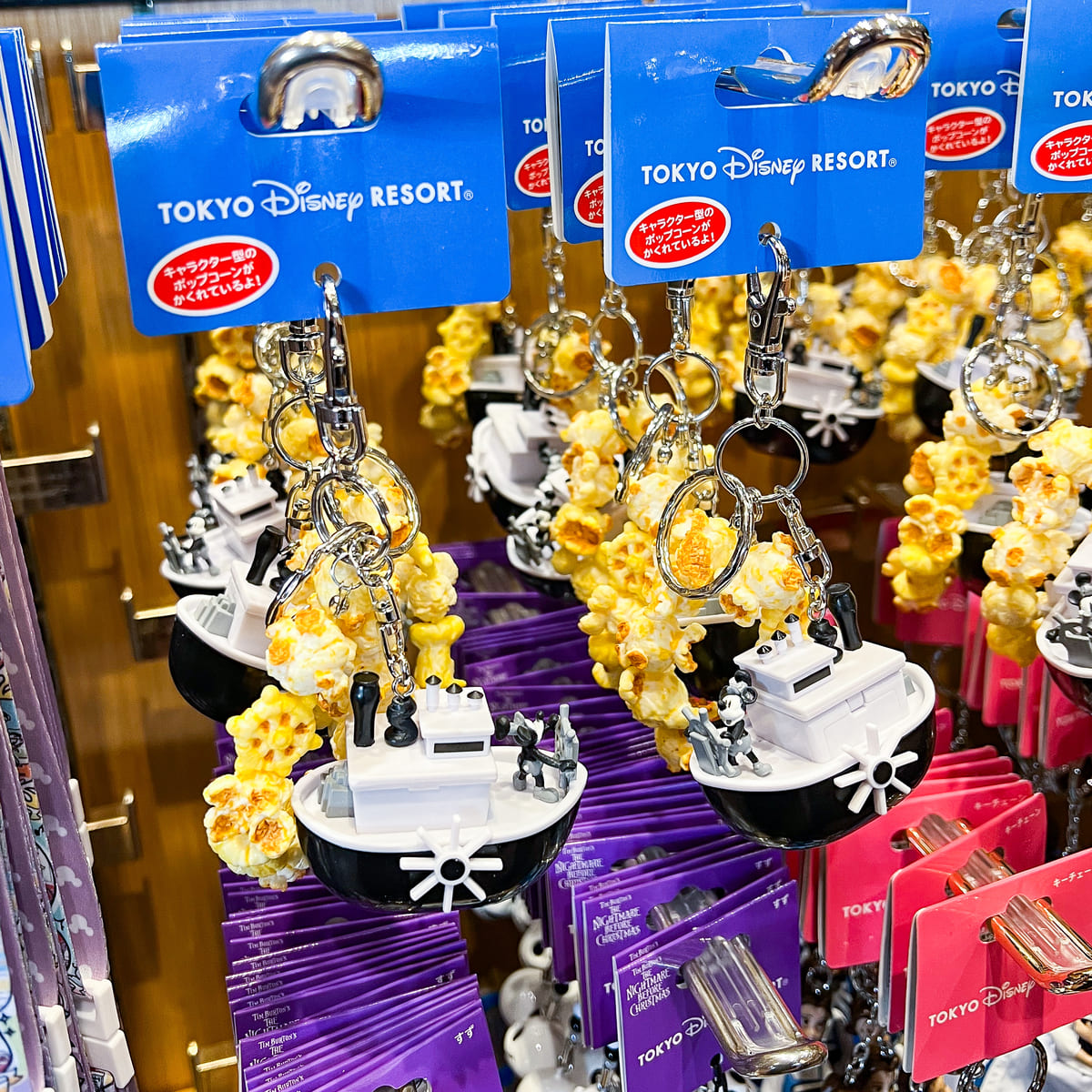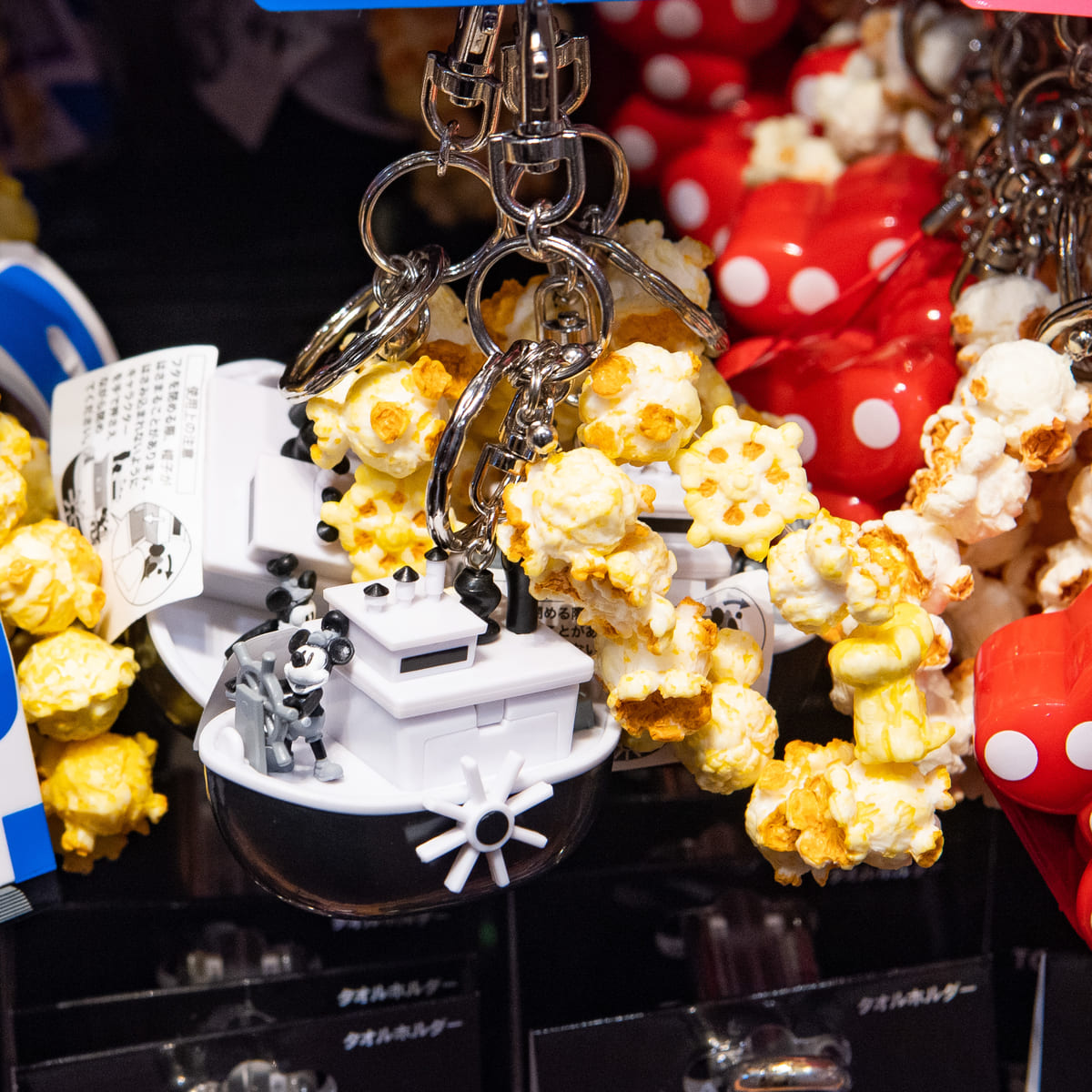 かわいいポップコーンバケットとポップコーンがデザインされた定番キーチェーンのお土産に『蒸気船ウィリー』デザインが登場!