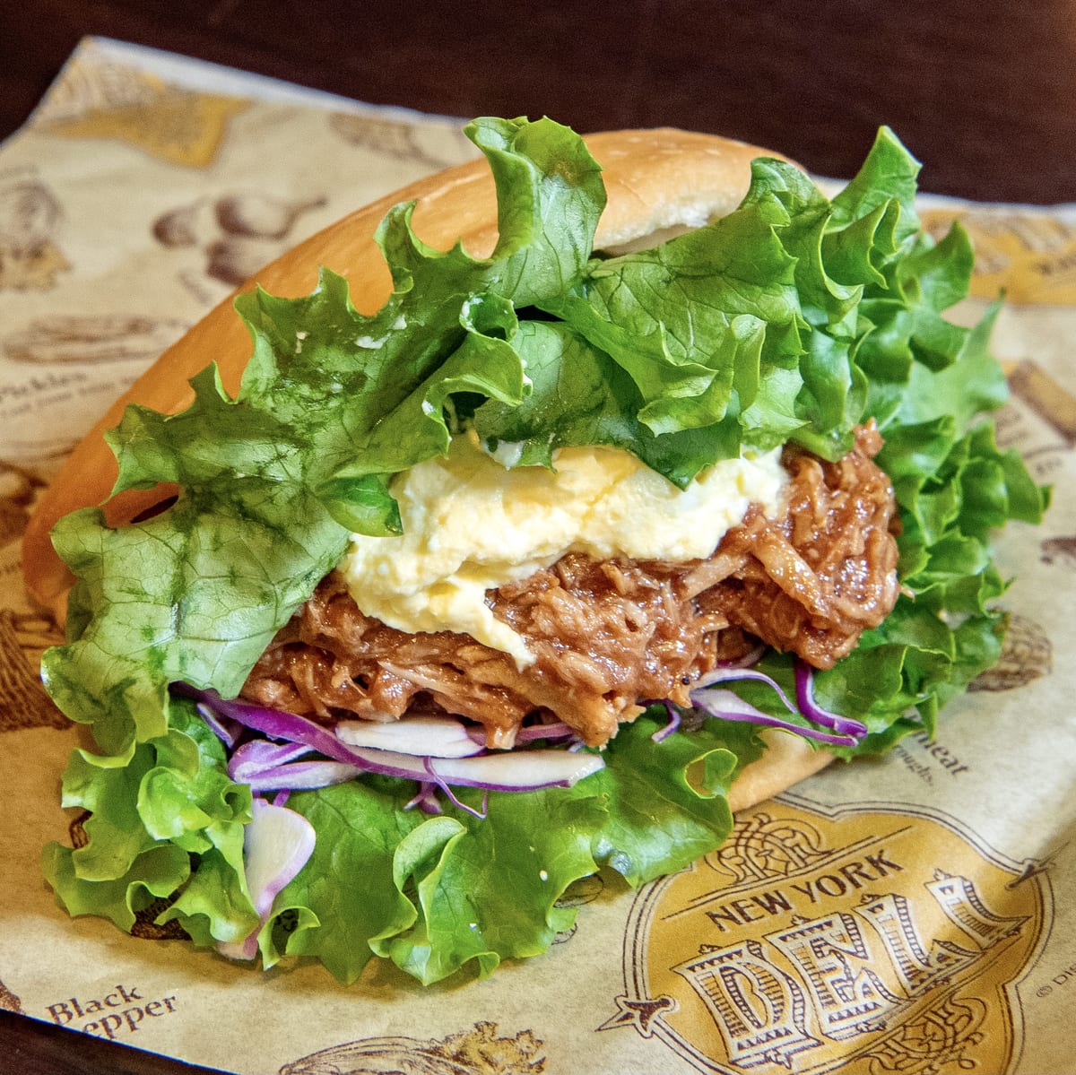 バーベキューソースで味付けされたプルドポーク、たまごスプレッド、トマト、紫キャベツ、グリーンカールなど野菜がサンドされたボリューム満点のサンドウィッチ。