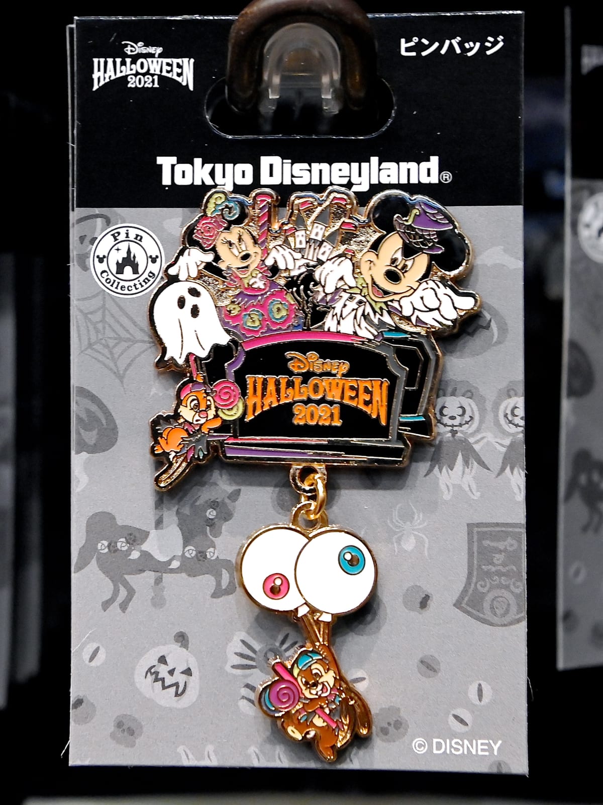 目玉のバルーンにつかまったチップのチャームが揺れる“ディズニー・ハロウィーン2021”ピンバッジ。
