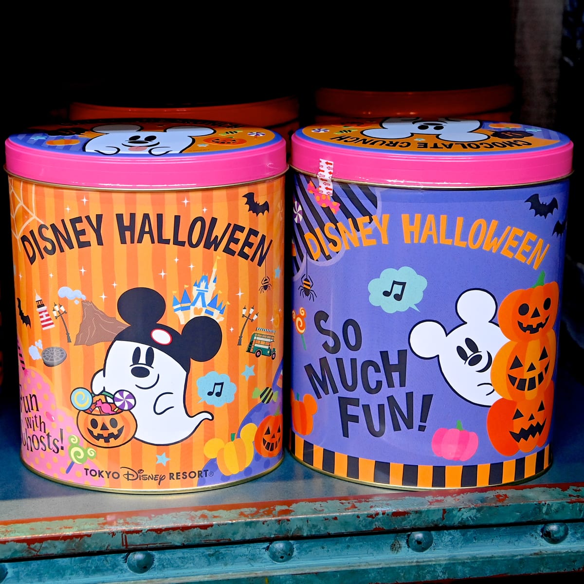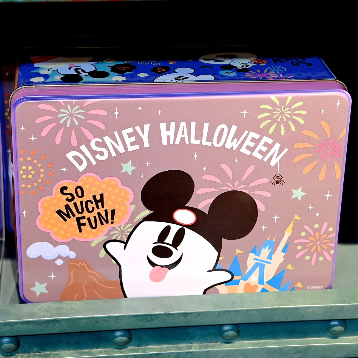 パークを楽しむゴーストたちがデザインされた缶入りのスウィーツ詰め合わせ。