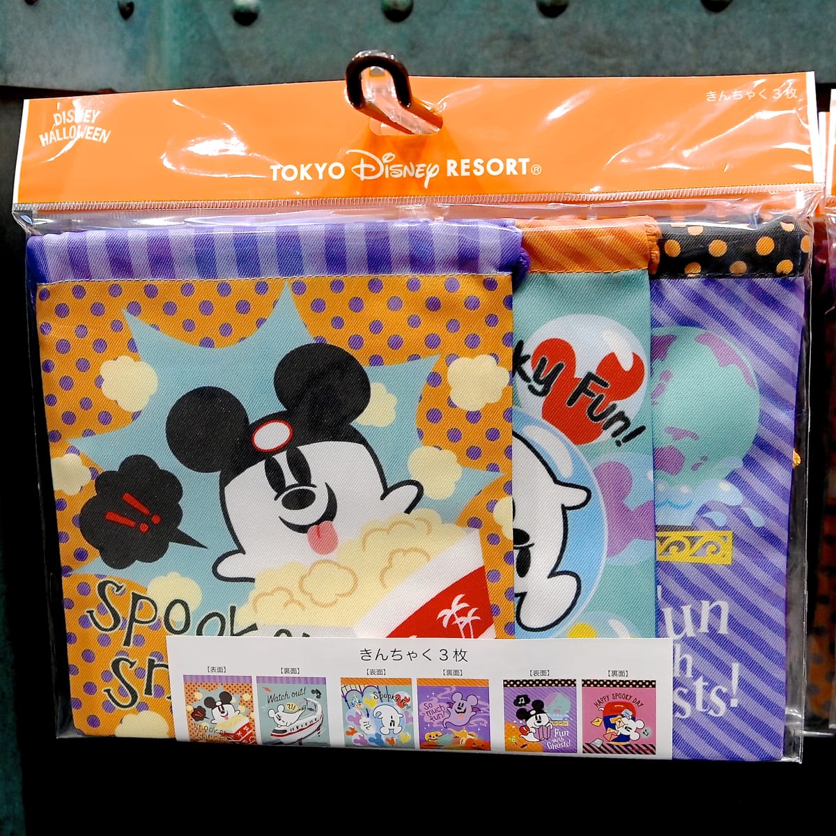 ミッキーバルーンとゴースト、花火とゴースト、お菓子とゴースト柄のミニタオル3枚セット。