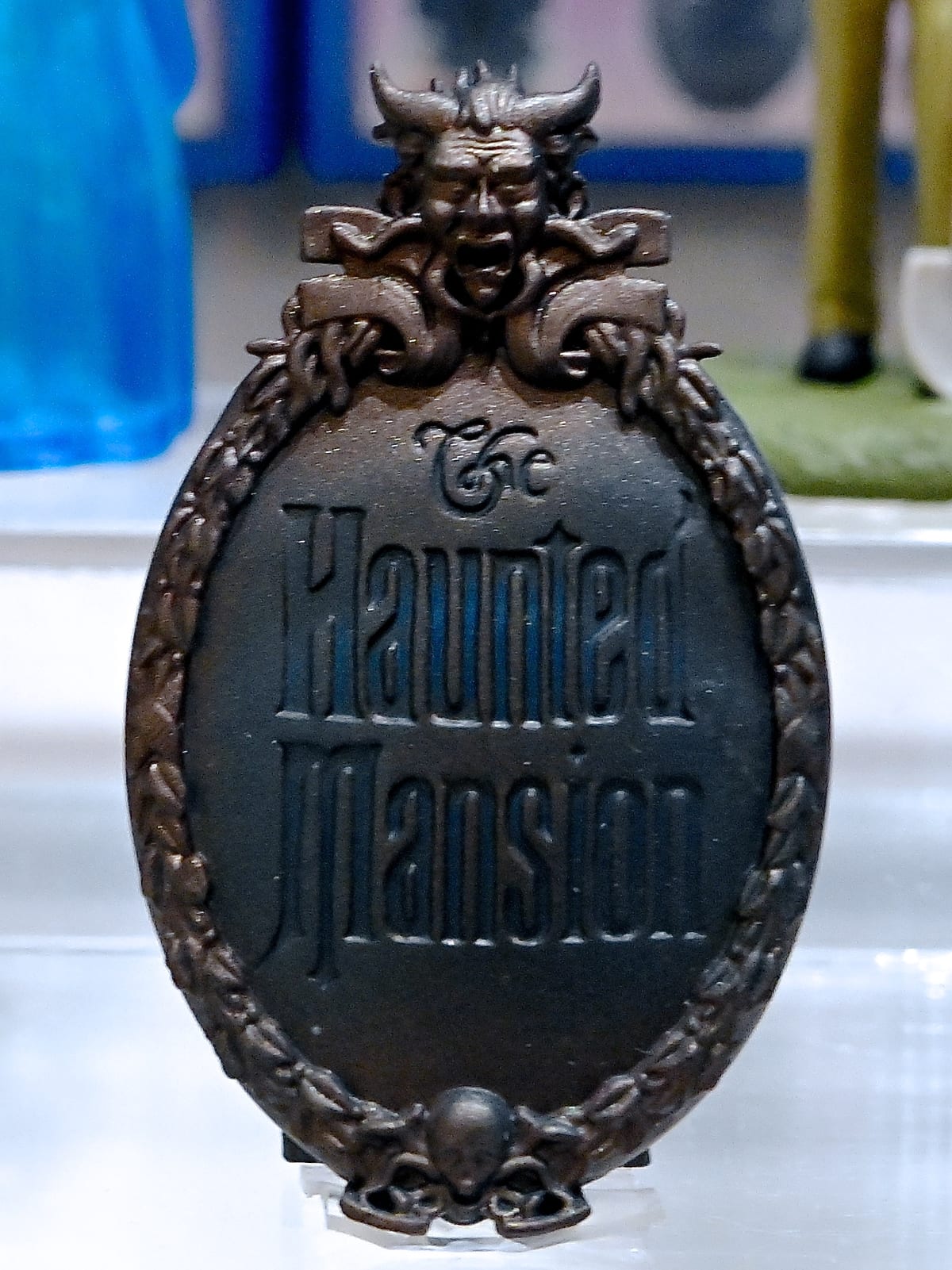 アトラクション「ホーンテッドマンション」のロゴがデザインされた看板のミニフィギュア。