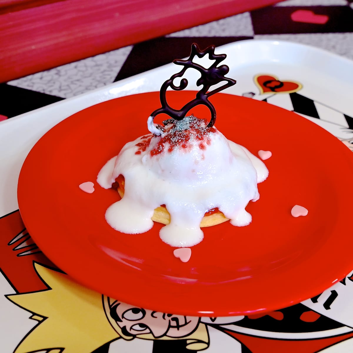 パンケーキには、ストロベリーソースの上にラズベリームース、ヨーグルトクリーム、ハートの女王のシルエット型チョコレート、銀箔がトッピングされています☆