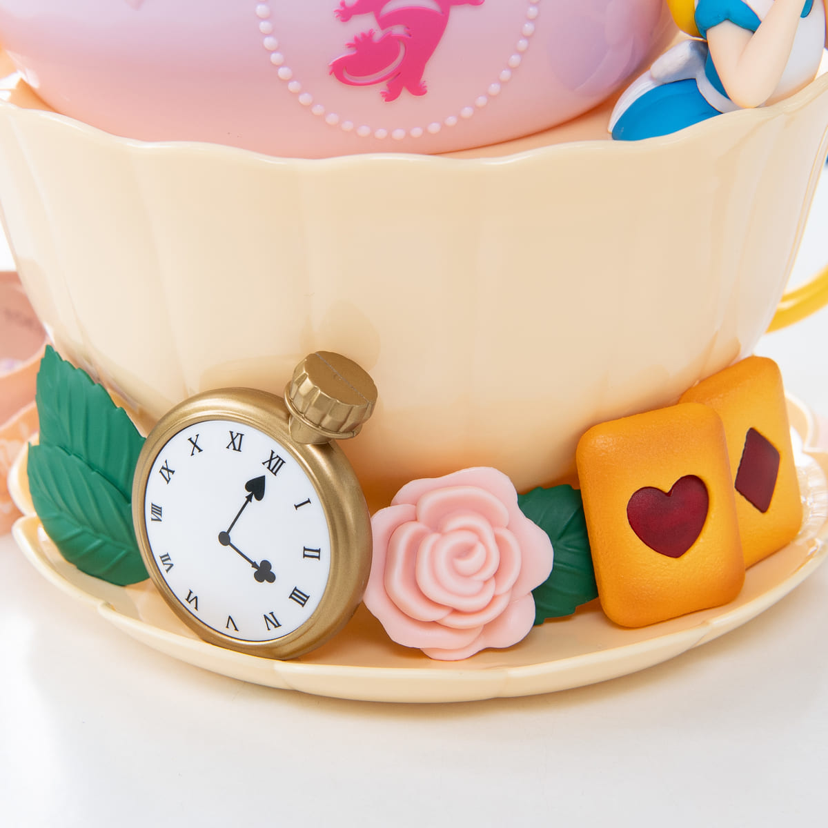 ティーカップには白うさぎの懐中時計やハートやダイヤのクッキー、バラが添えられ、