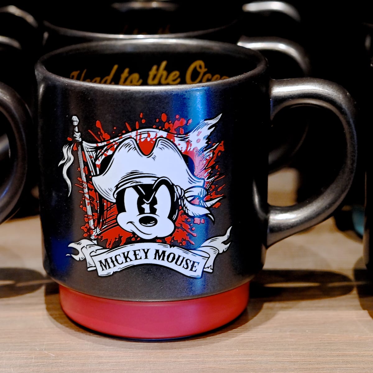 赤い水しぶきが格好いい海賊ミッキーマウスのマグカップ。