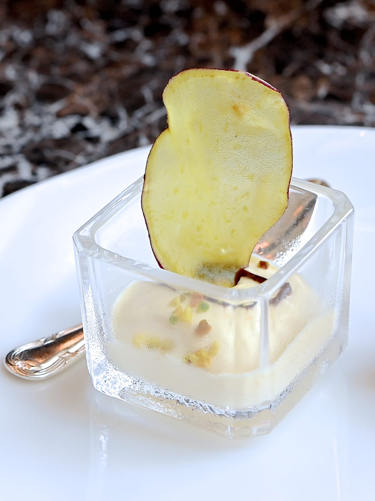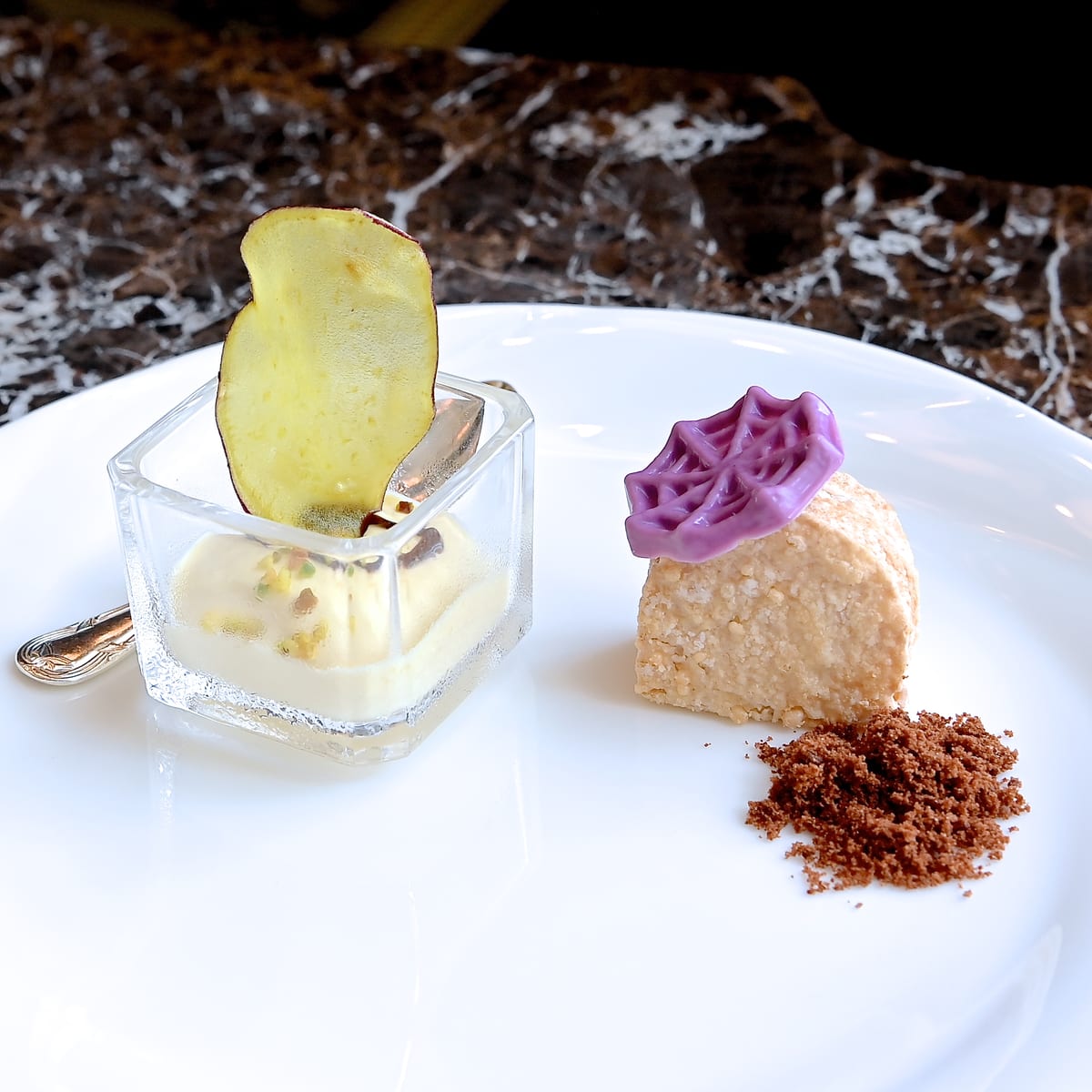 さつまいものムースの上にはさつまいもチップス、ピスタチオ、バルサミコソース。