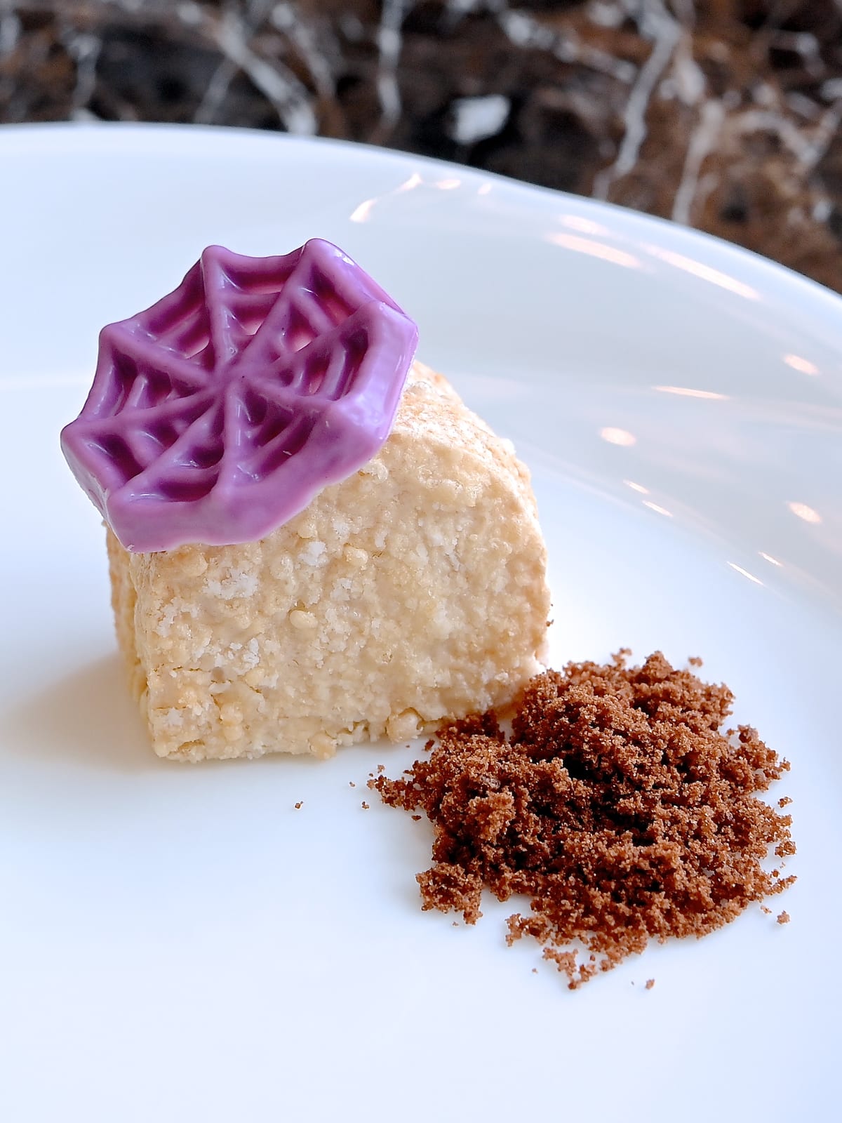 蜘蛛の巣や土をイメージしたデザートは、クルミのダックワーズとクランチパウダー。