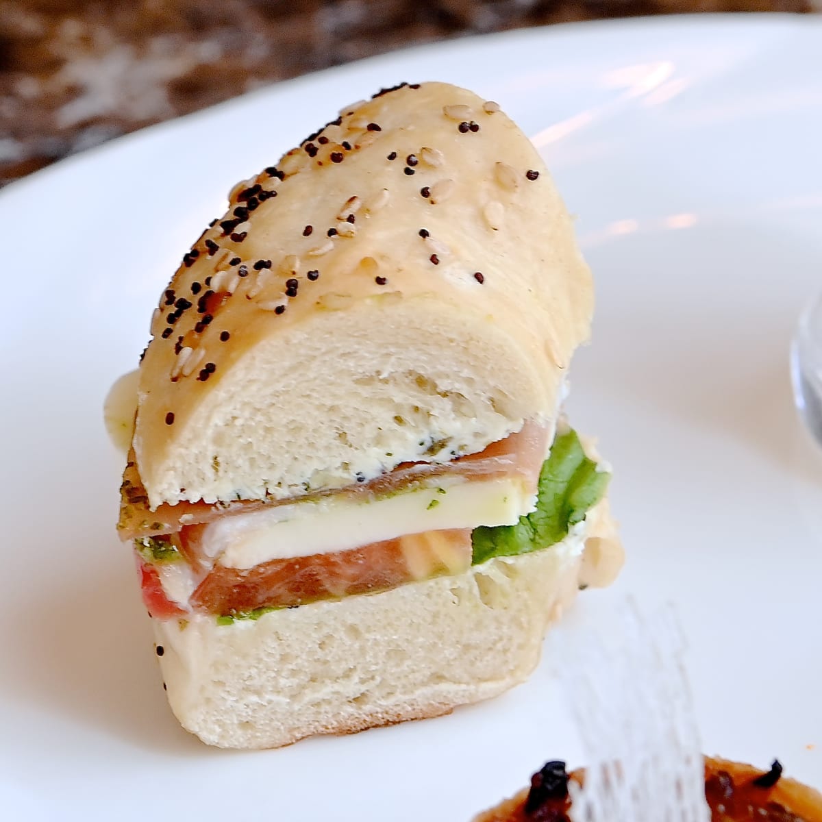 生ハム、モッツァレラがサンドされた食べごたえのあるベーグル。