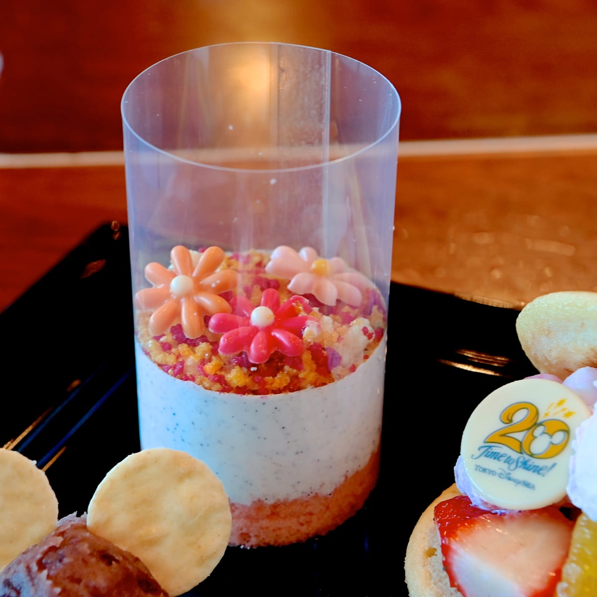 ミッキーマウス、ミニーマウス、20周年のロゴ、「レストラン櫻」らしい桜がデザインされたスペシャルデザートです☆