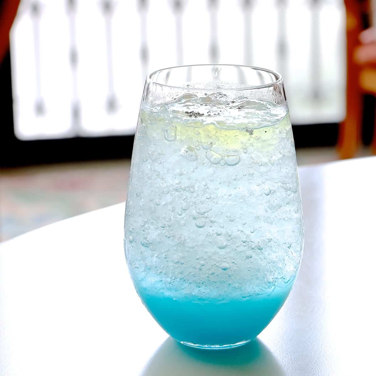 青森産 ふじりんごジュース、カルピス、スプライト、ブルーシロップ、グリーンアップルシロップ、レモンジュース、レモンゼリー入りのさわやかなスペシャルドリンク。