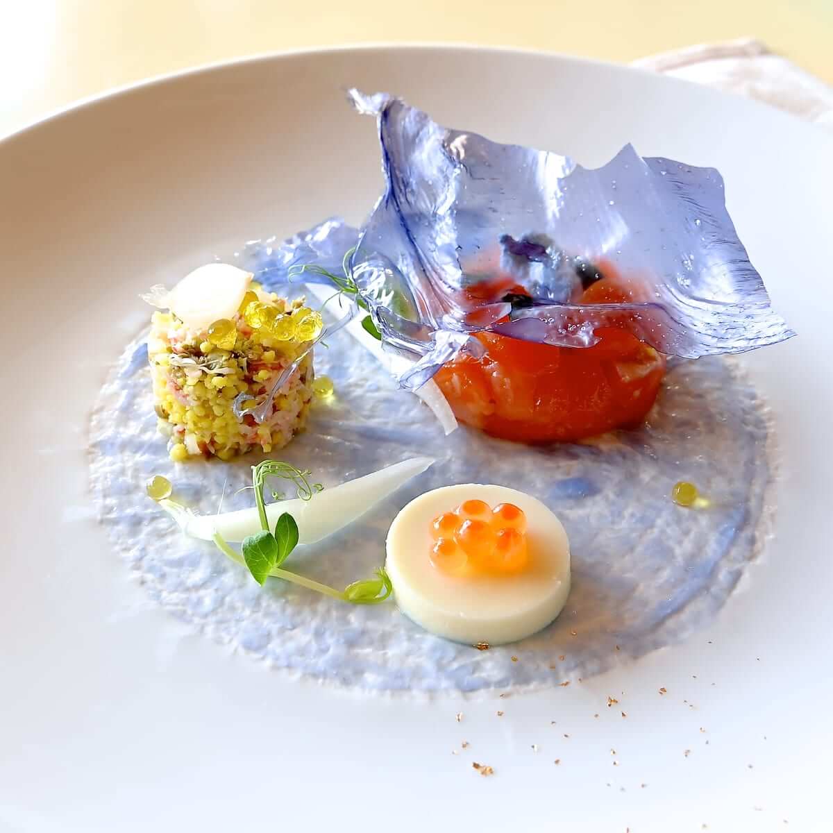 信州サーモンのティンバッロ ピュアホワイトのパンナ・コッタ 蟹とクスクスのインサラータ