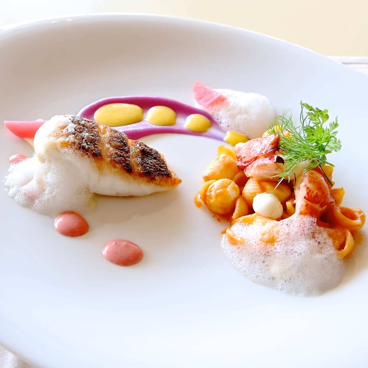 本日の魚のインパデッラ 雲丹のクリームとプッタネスカのフォーム コンキリエッテ オマール海老のペスカトーレ