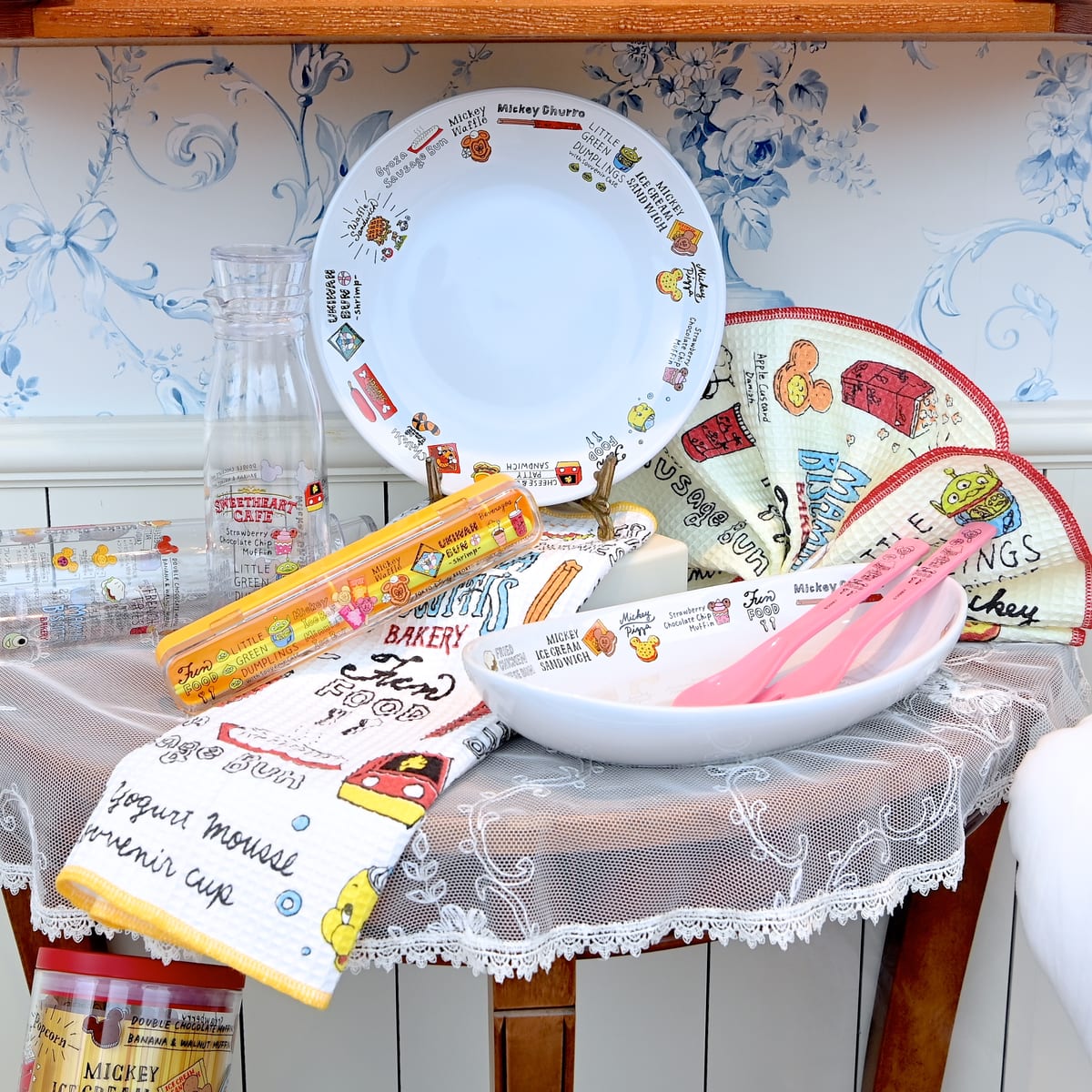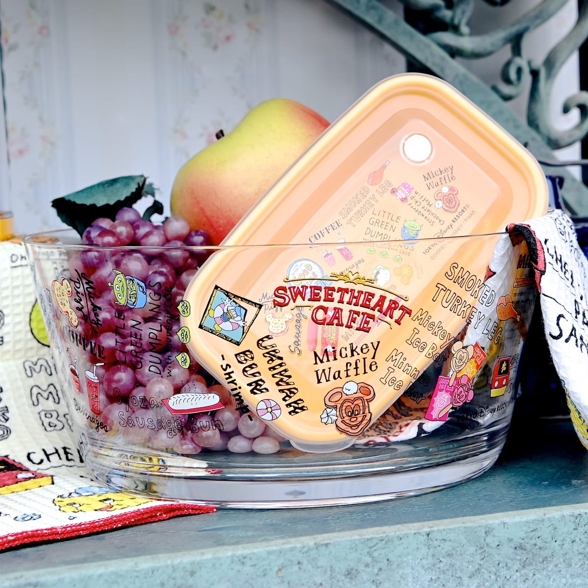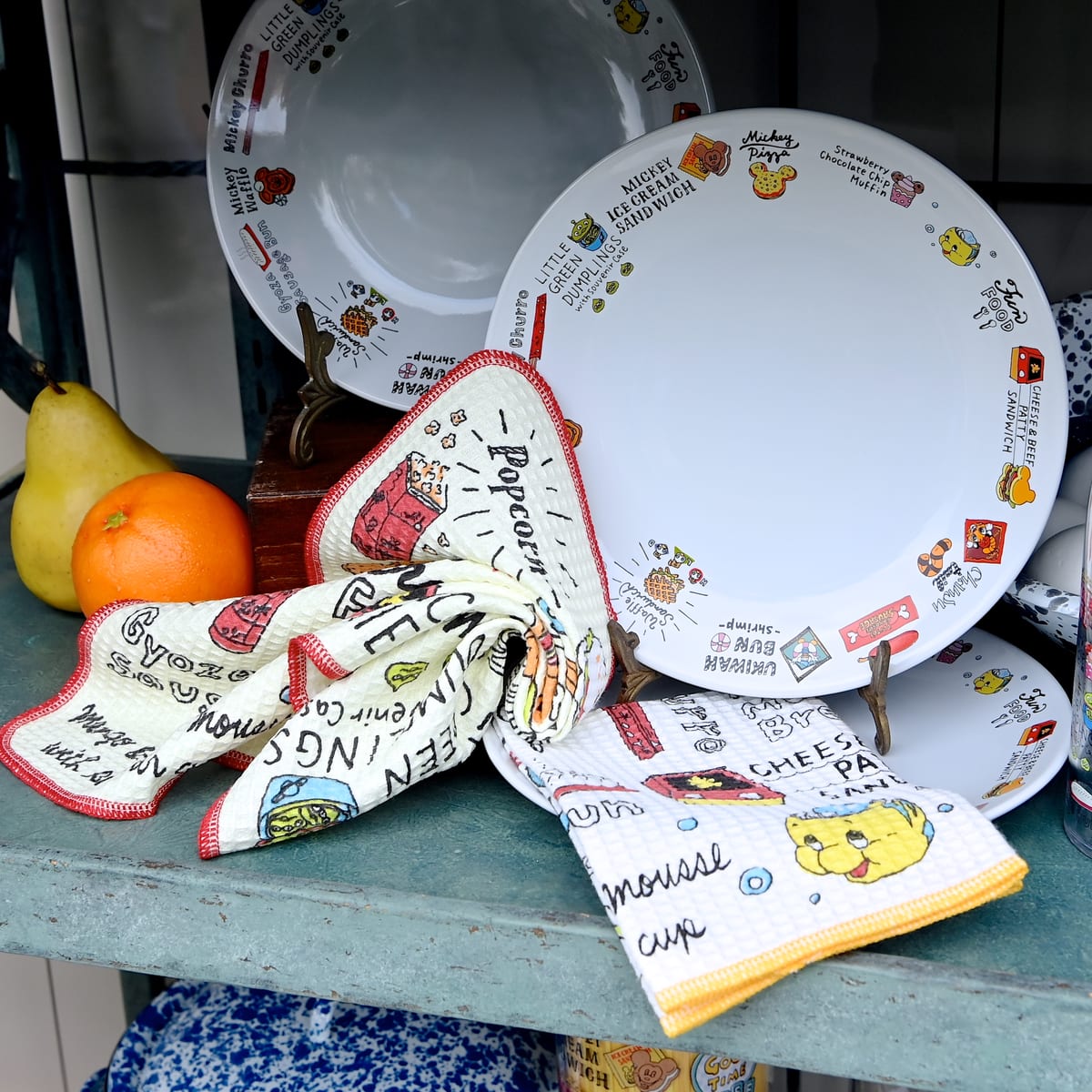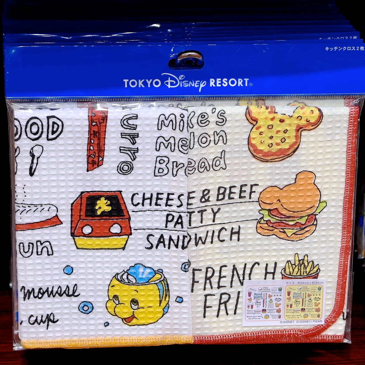 リトルグリーンまんやミッキーチュロス、ギョウザドックなどパークフードが総柄でデザインされたキッチンアイテム。