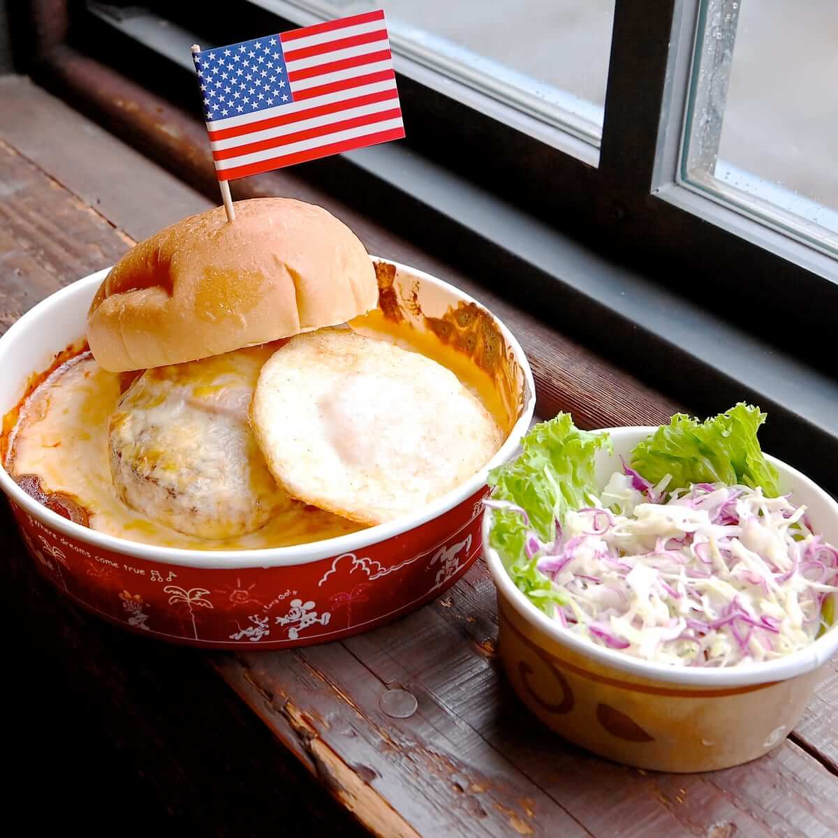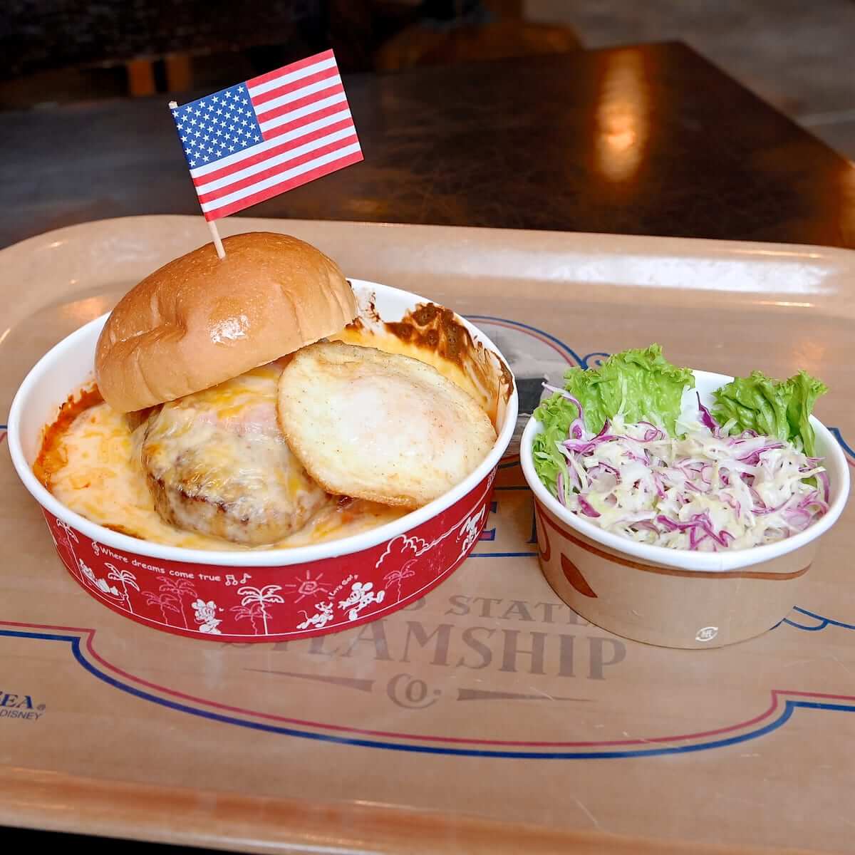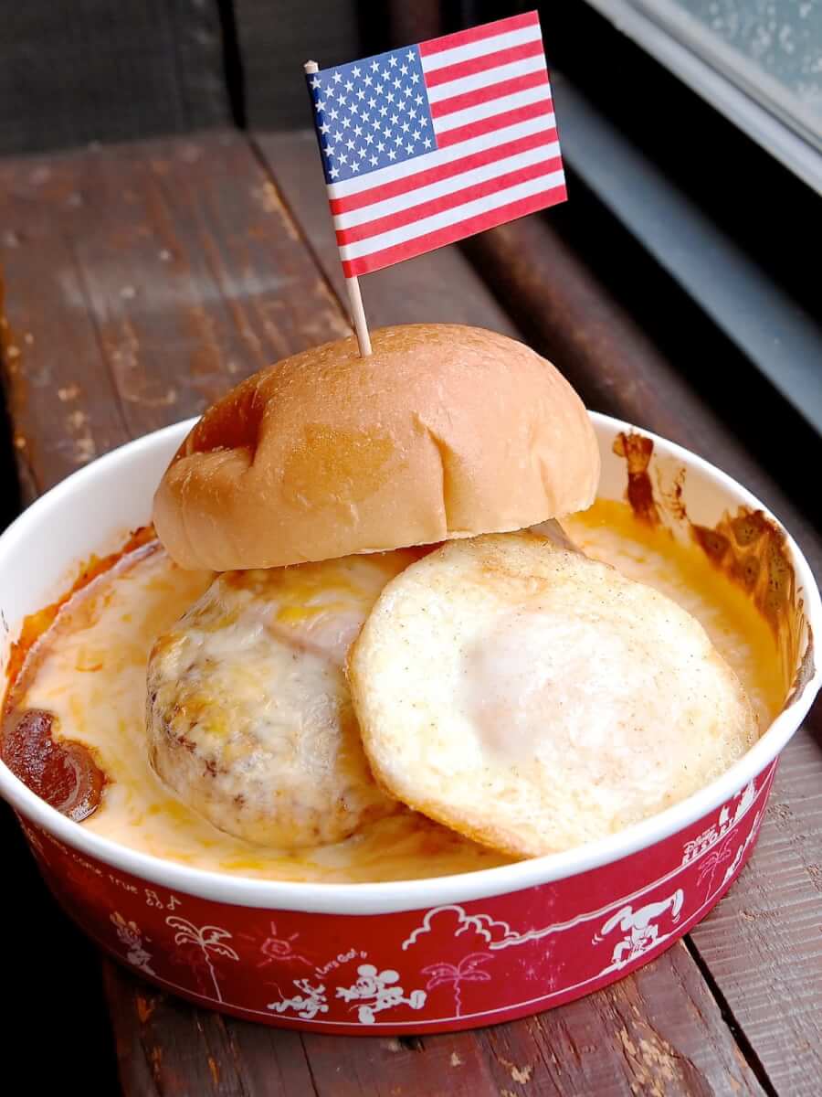 アメリカンウォーターフロントにあるドックサイドダイナーらしいメニュー"ベーコンエッグバーガー グラタン仕立て、コールスロー付き"が登場中!