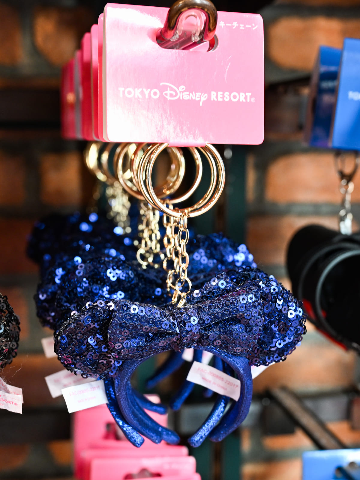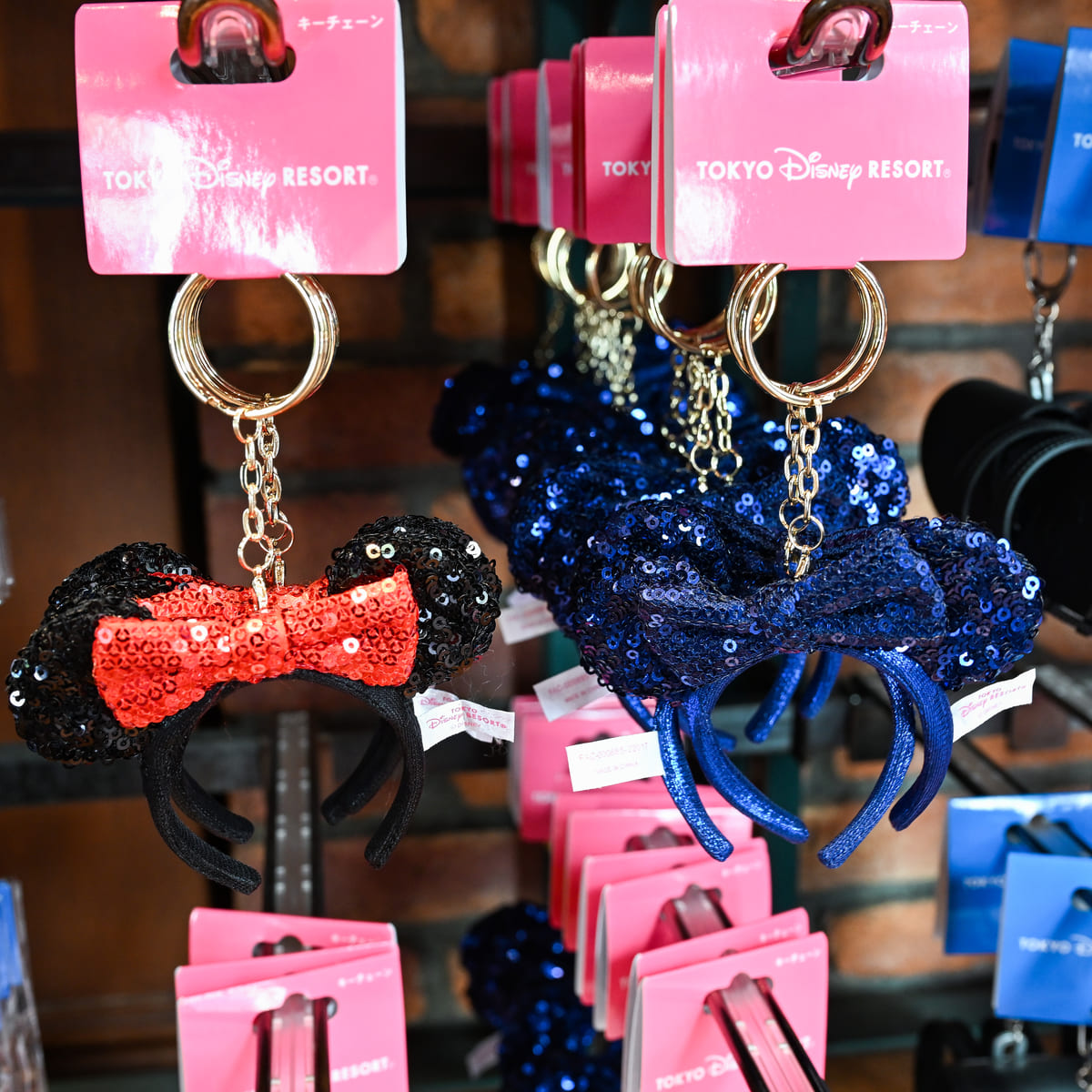 ミニーのスパンコールカチューシャ、ブラックデザインのキーチェーン。