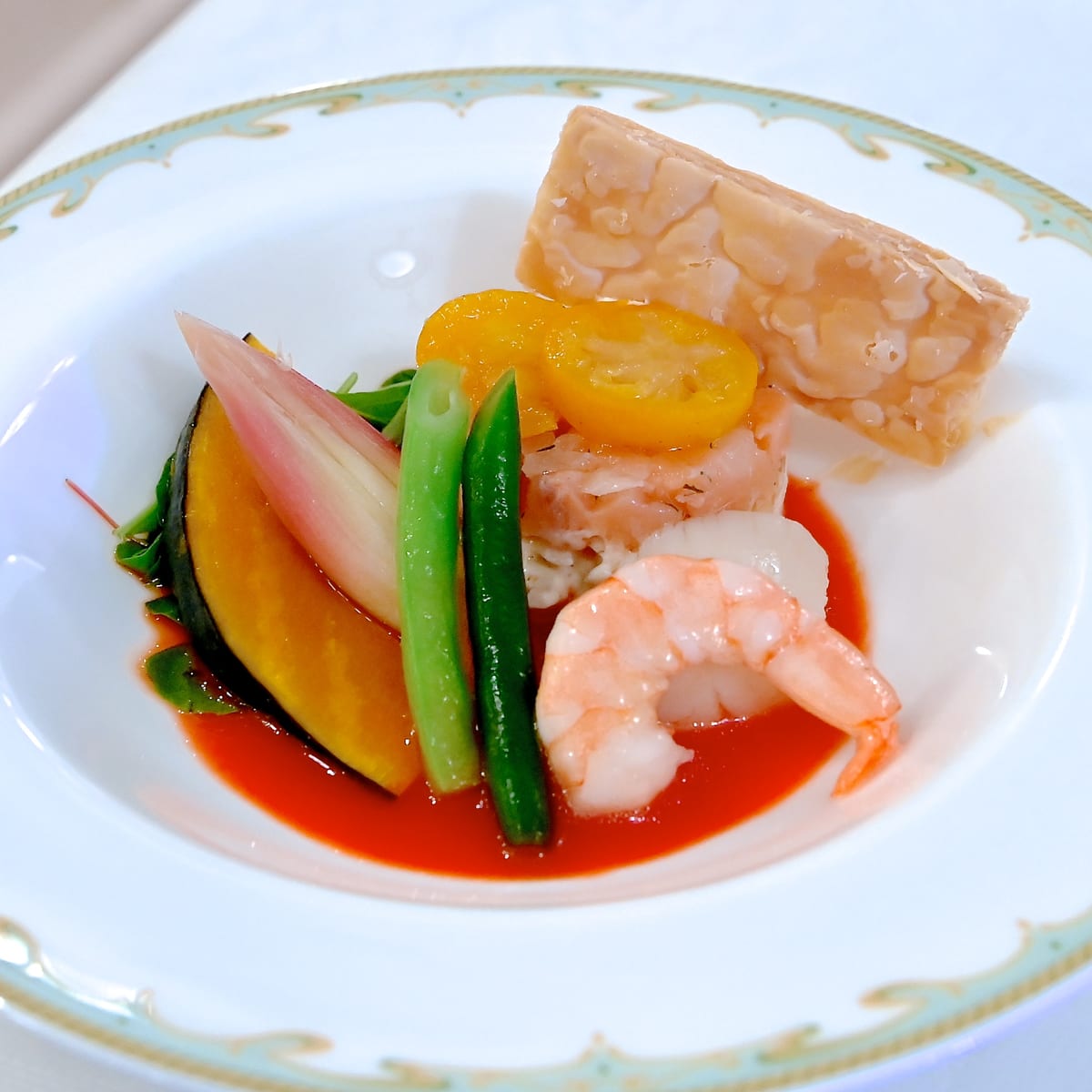 スモークサーモンのガトー仕立て、海老と帆立貝、ベジタブルマリネ