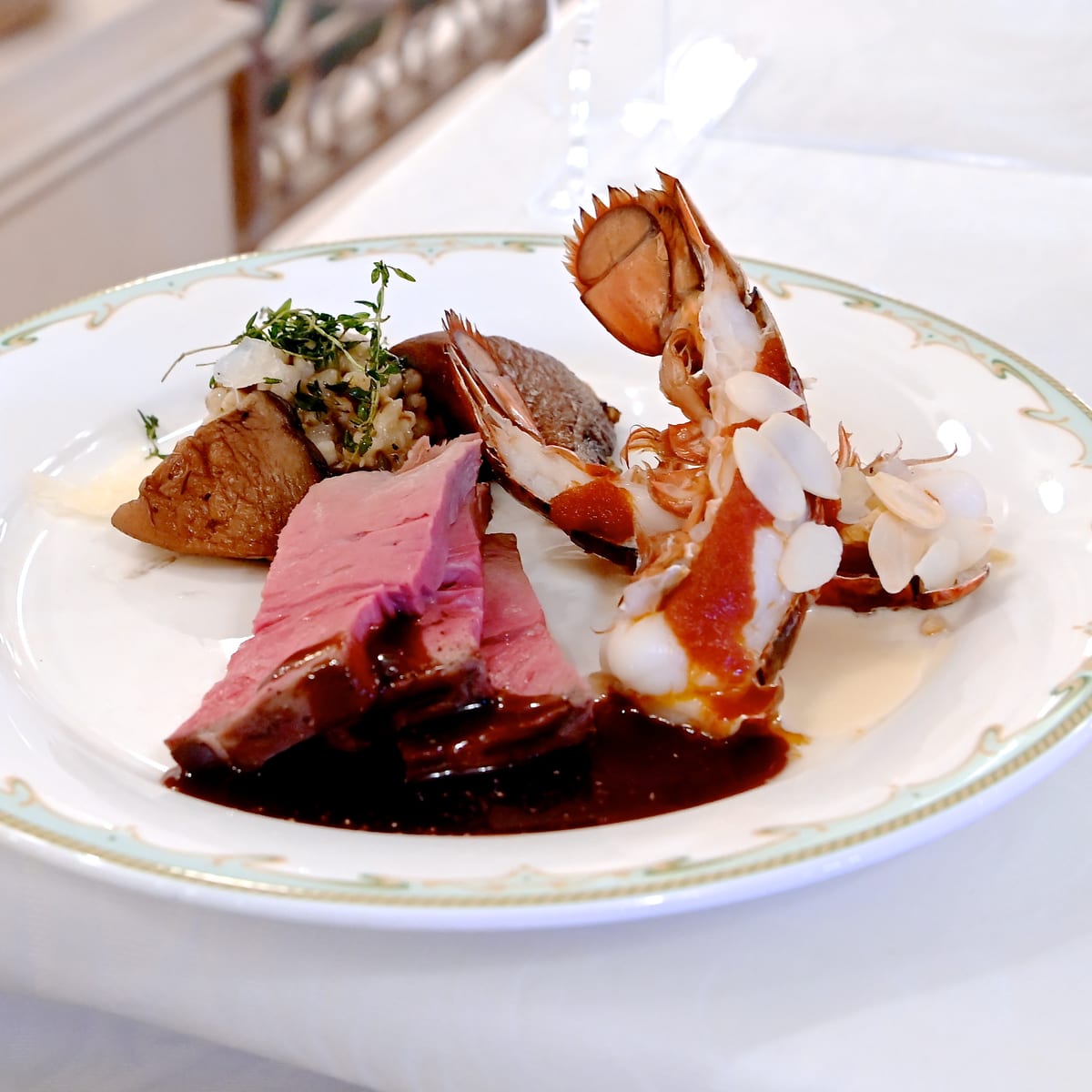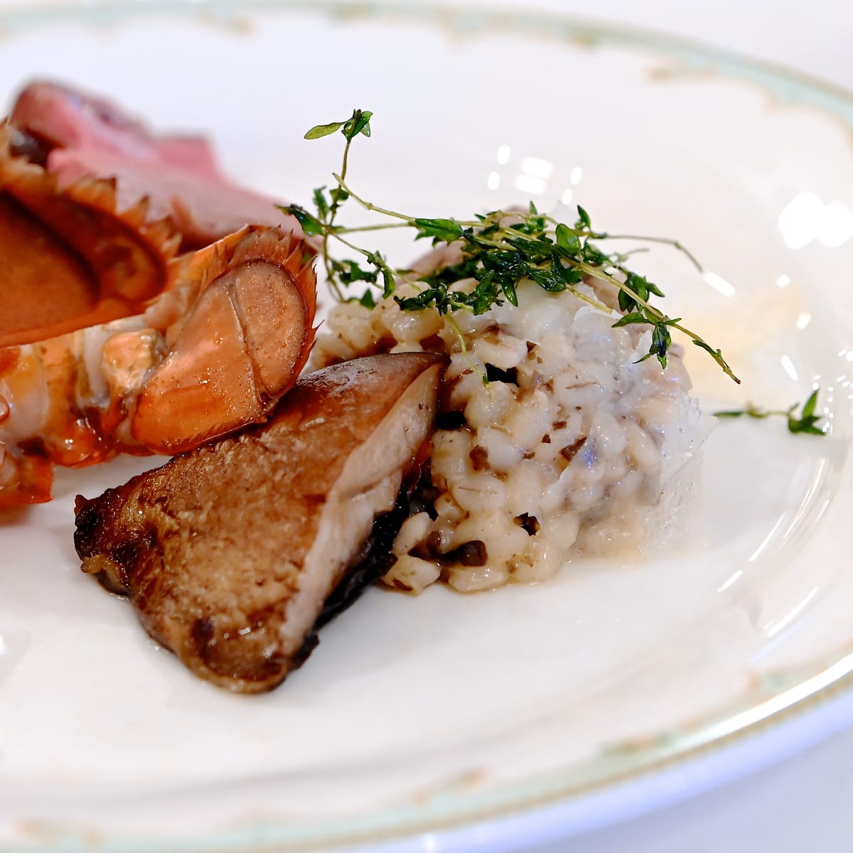 ローストビーフとオマール海老のオーブン焼き ポータベッラのフライとオルツォのリゾット、ナッツ添え