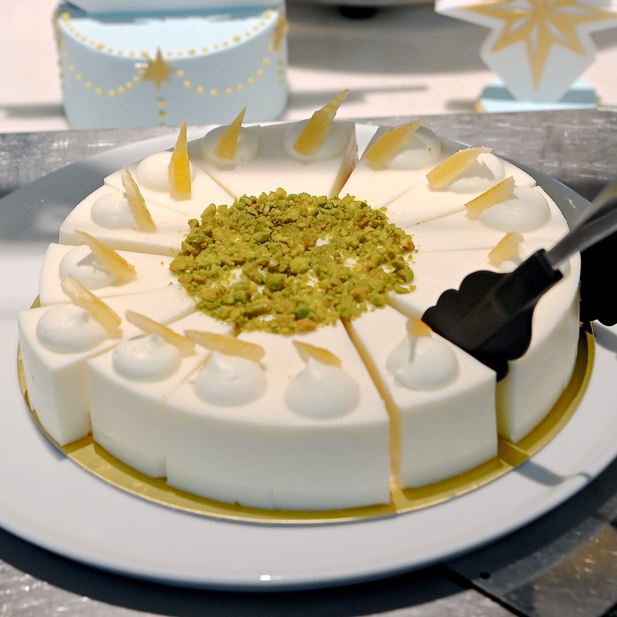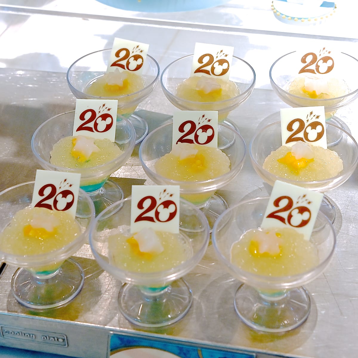 20周年のロゴチョコレート、星がトッピングされたブルー×イエローのタイム・トゥ・シャイン!らしいデザート。