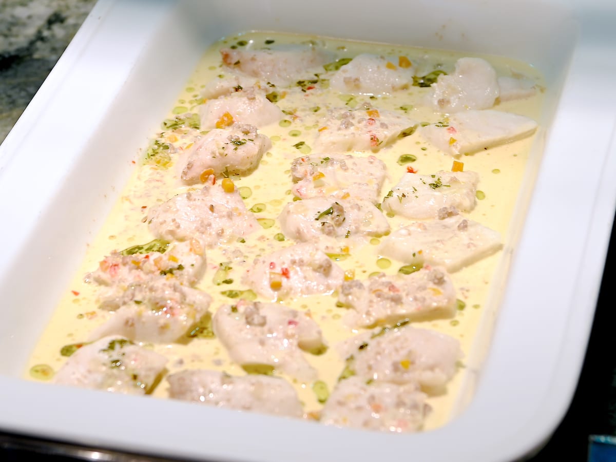 白身魚のスチームは、ピリ辛なチョリソークリームソースで。