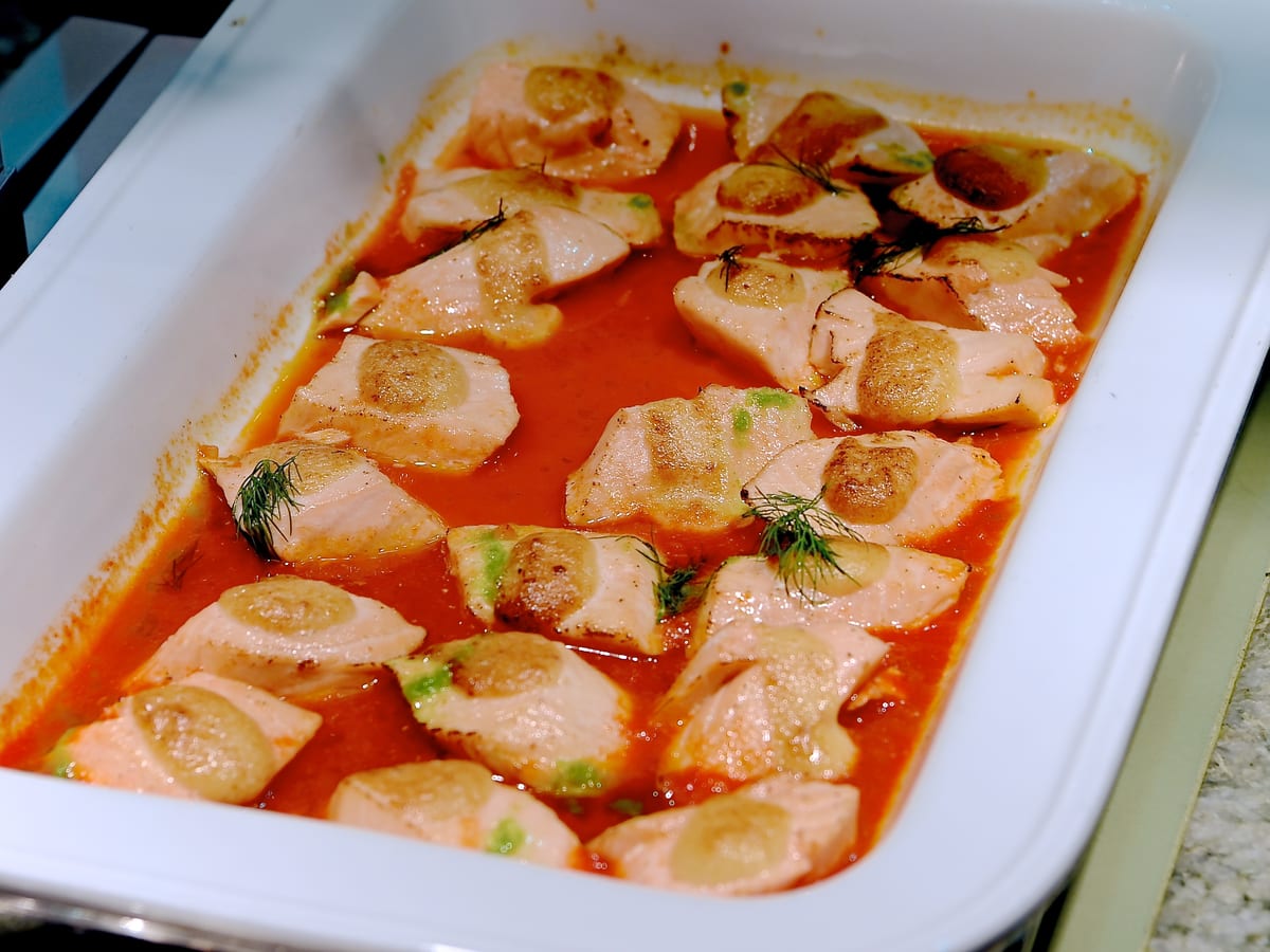 サーモンのグラティネ 赤パプリカソース