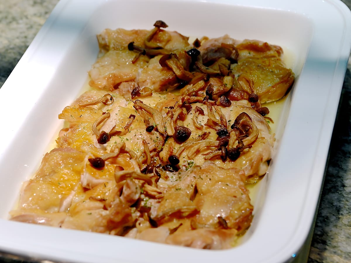 きのこがトッピングされたローストチキン。