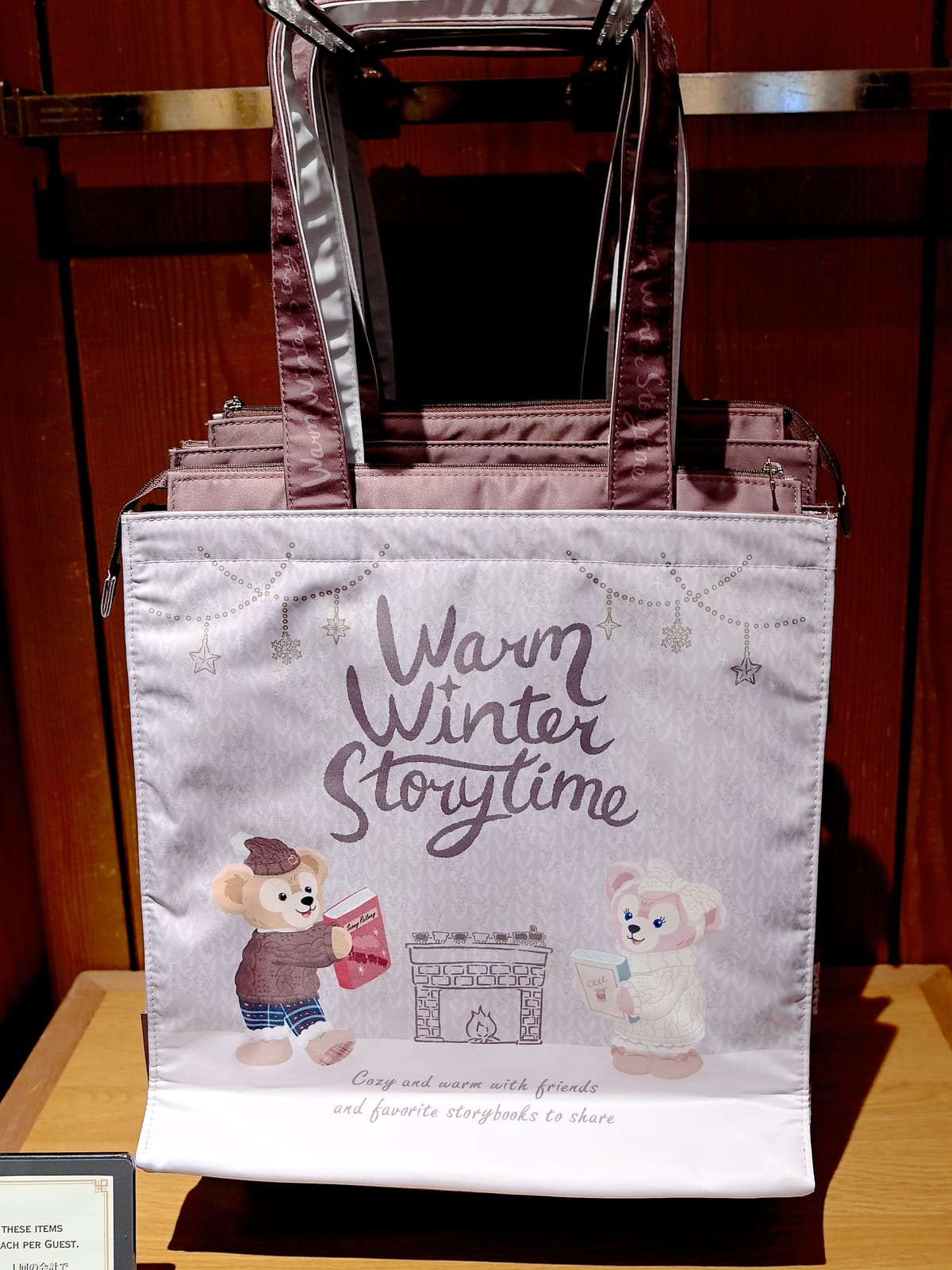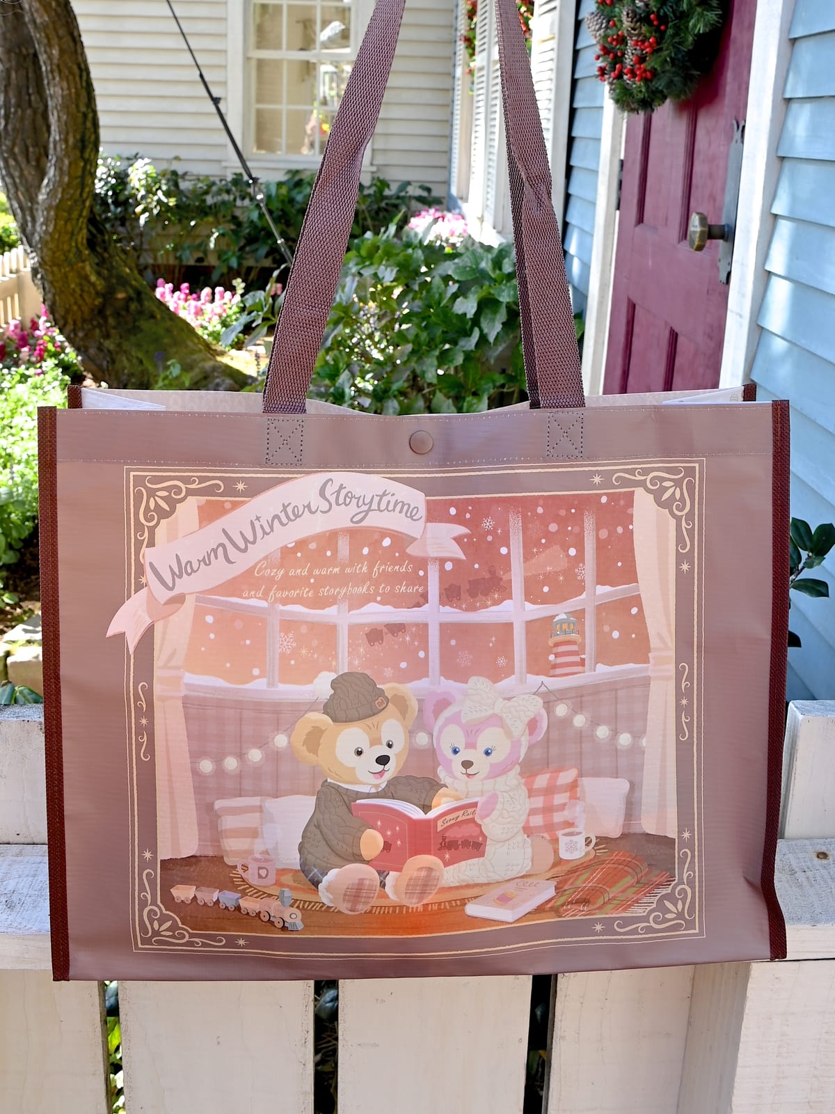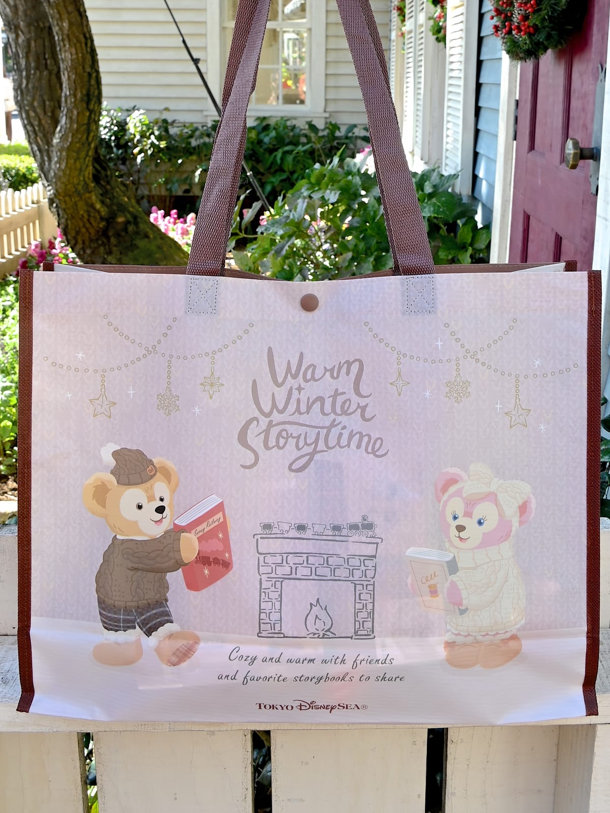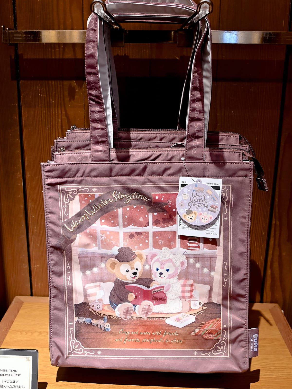 お部屋で絵本を読むダッフィーとシェリーメイのアートがかわいいショッピングバッグ。