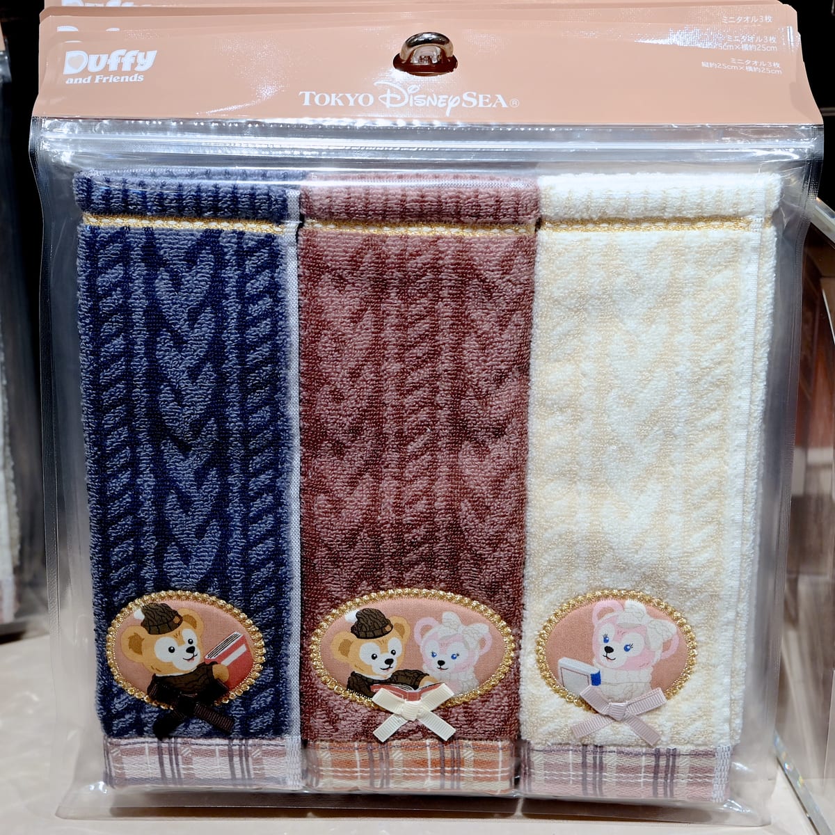 落ち着いたカラーで普段遣いにもぴったりなダッフィー、シェリーメイデザインのミニタオル3枚セット。