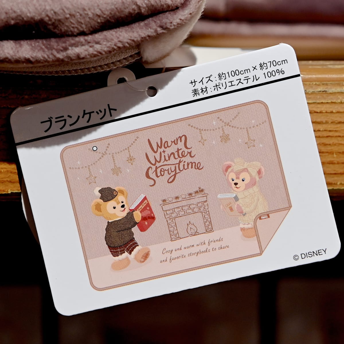 ウォームウィーンター・ストーリータイムの文字、暖炉、ダッフィー、シェリーメイがデザインされたブランケット。
