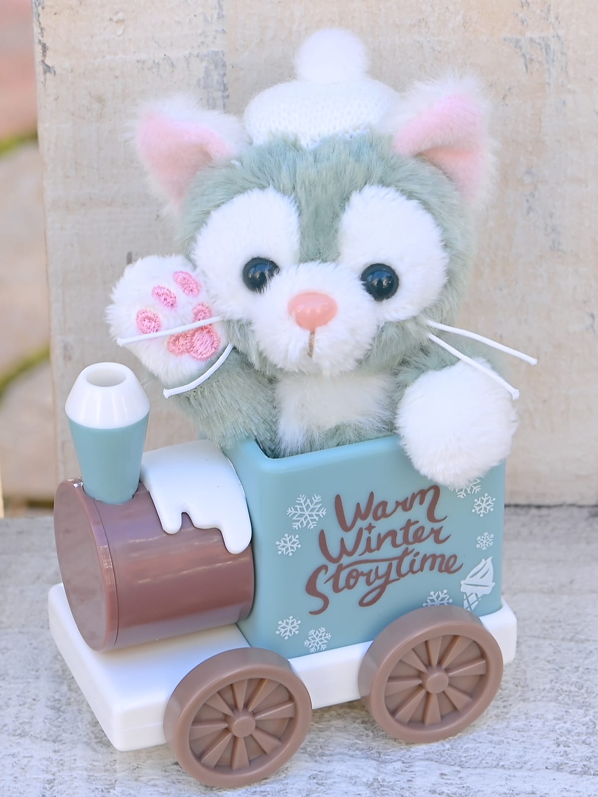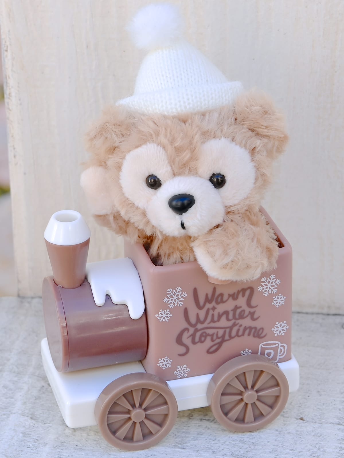 白いニット帽をかぶり汽車に乗ったダッフィーのぬいぐるみストラップ。