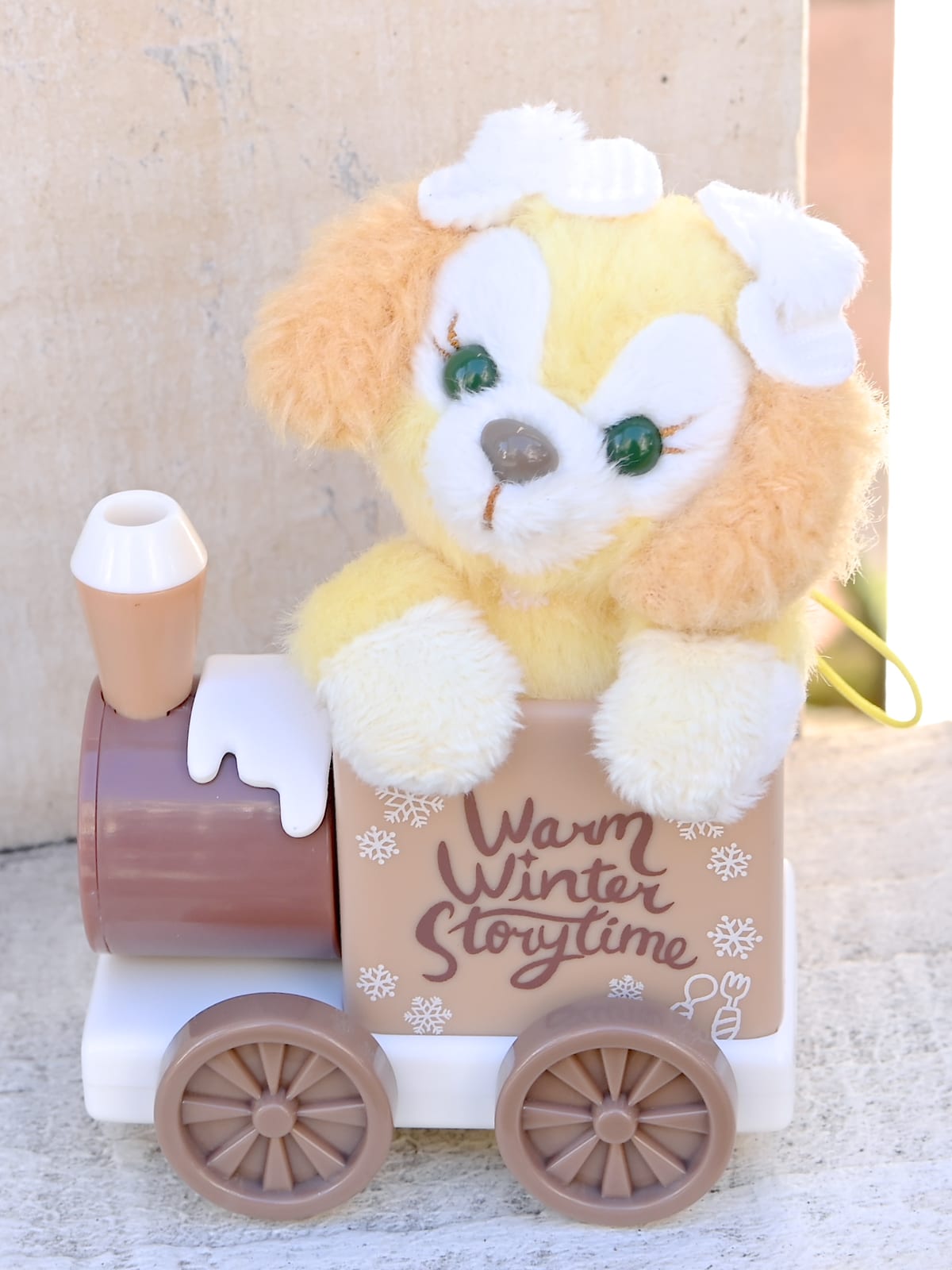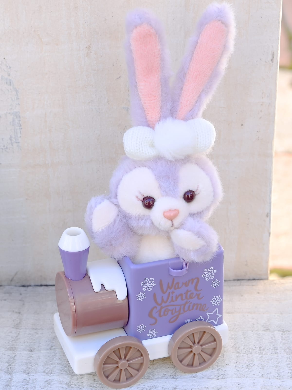 ふんわりかわいいリボンをつけ汽車に乗ったステラ・ルーのぬいぐるみストラップ。