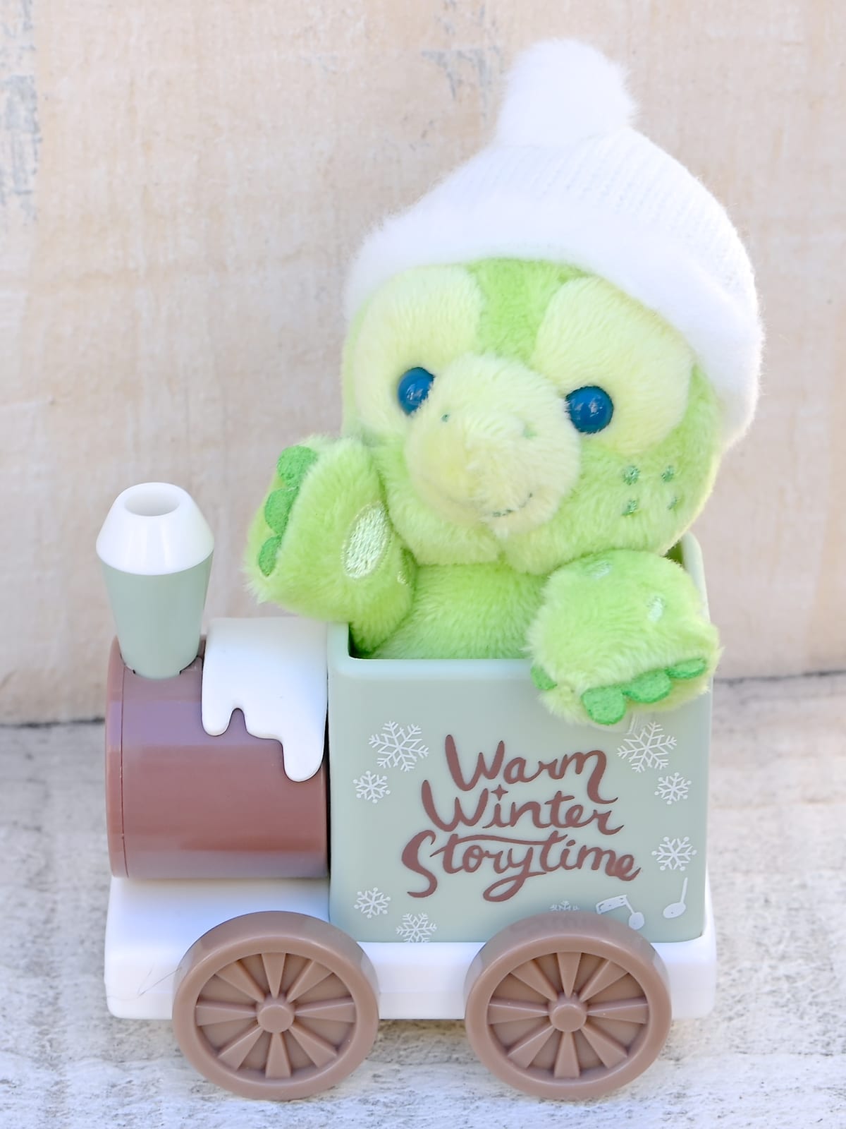 ニット帽をかぶり汽車に乗ったオル・メルのぬいぐるみストラップ。