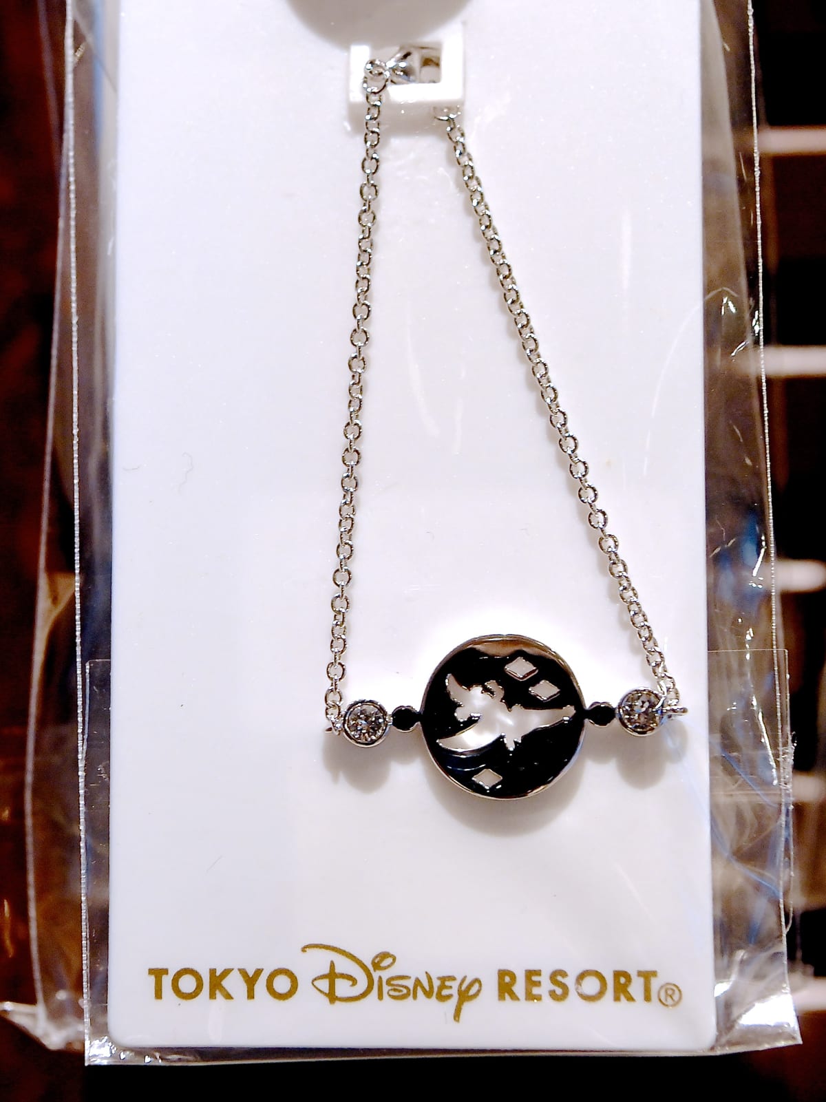 金の粉をまきながら宙を舞う美しい妖精「ティンカー・ベル」の全身シルエットがデザインされたブレスレット。