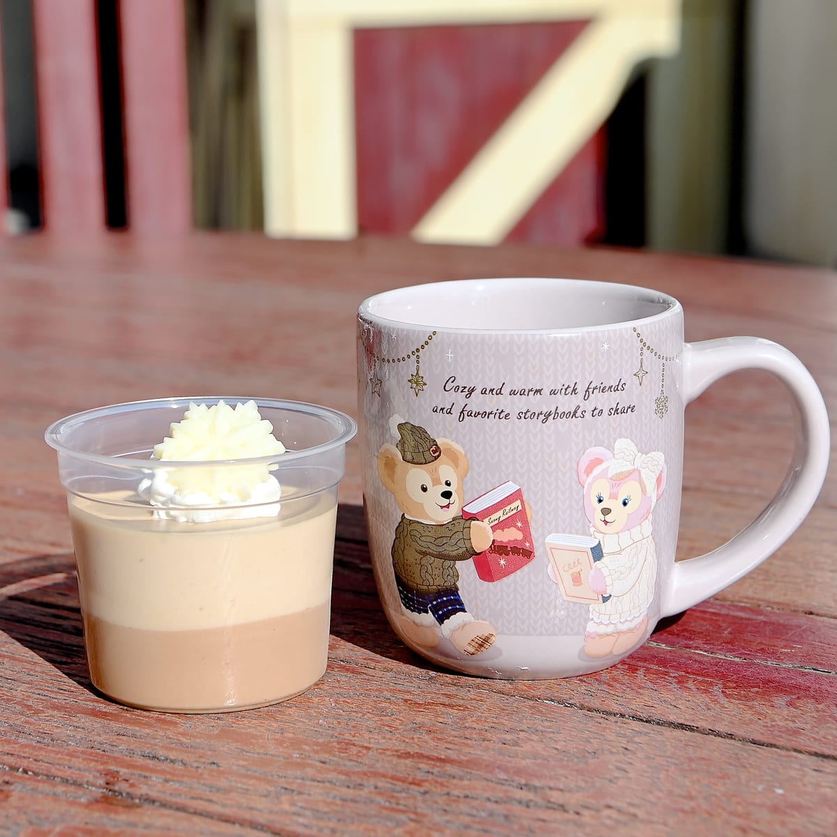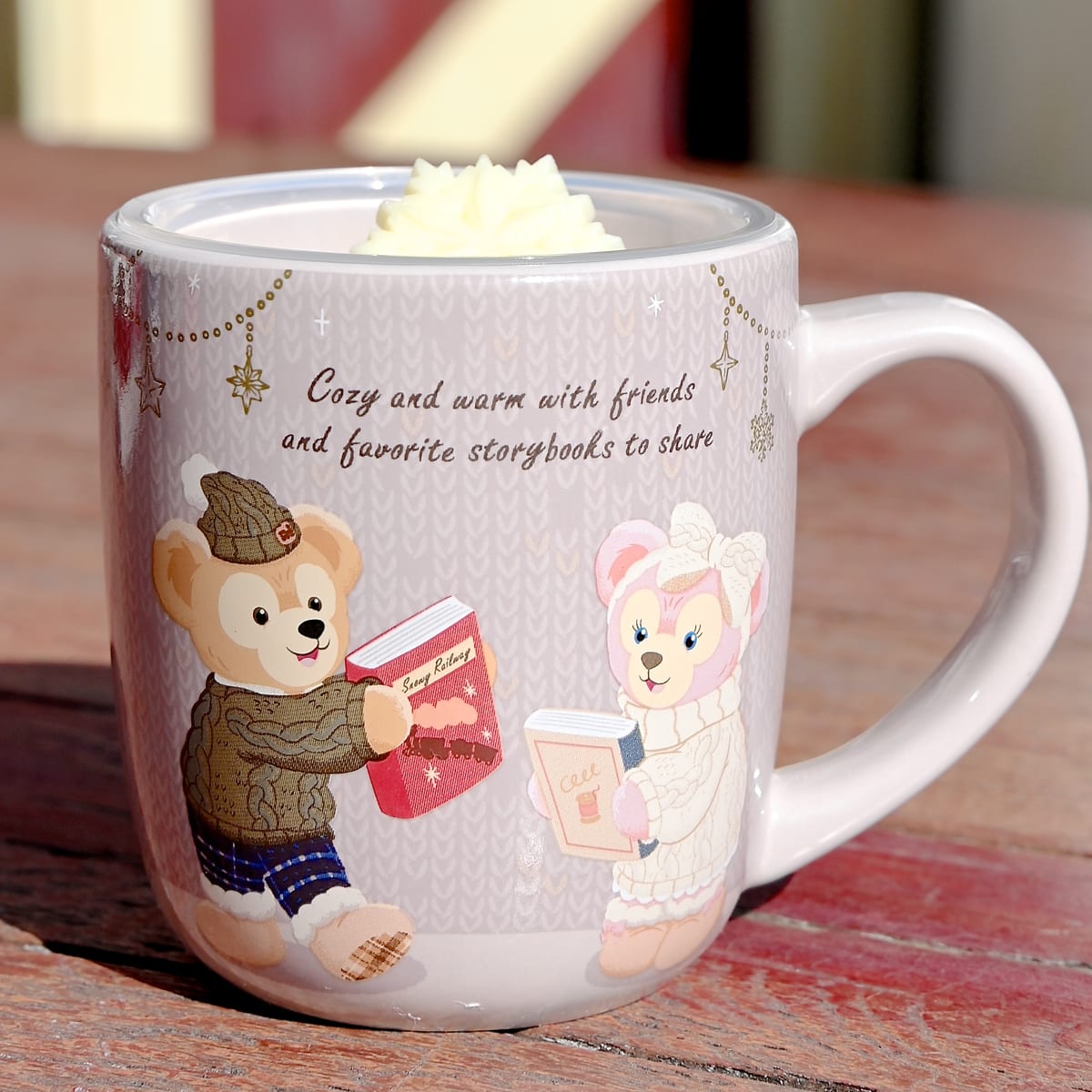 スーベニアカップには本を持ち楽しそうなダッフィーとシェリーメイ。