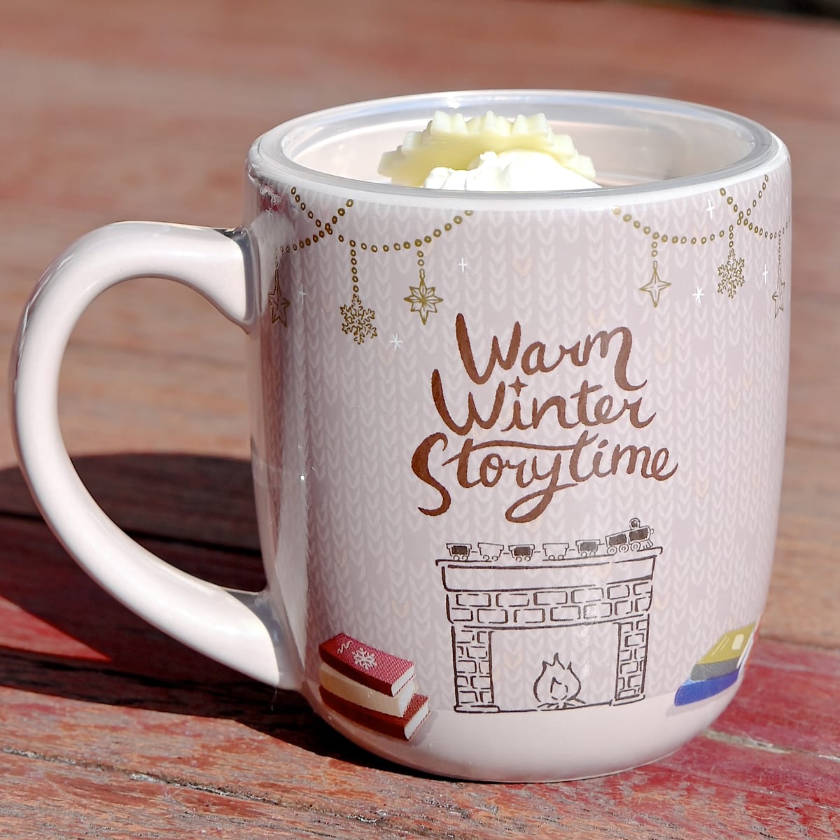 後ろ側にはウォームウィンター・ストーリータイムの文字、オーナメント、暖炉、汽車のおもちゃ、本がデザインされています。