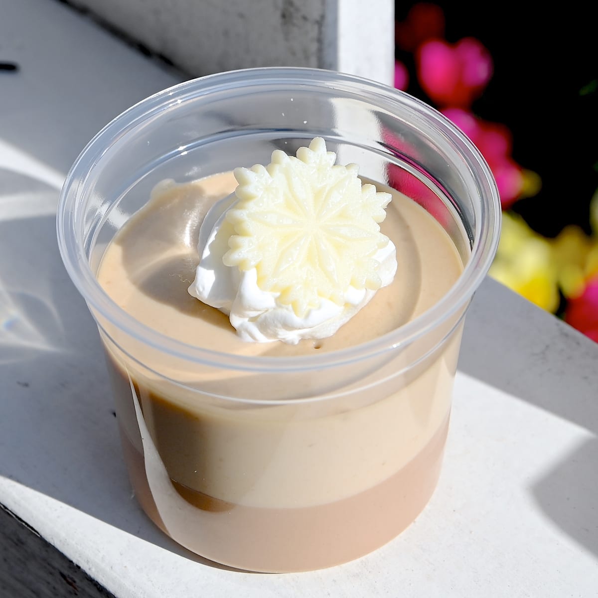 ホイップクリームとスノーフレーク型のチョコレートがトッピングされています☆