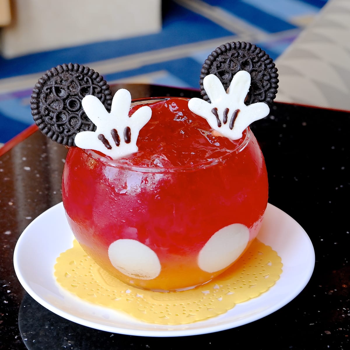 クランベリージュース、オレンジジュース、マンゴーシロップ、ストロベリーシロップ、グレナデンシロップ入りの「ミッキーマウス」カラーのドリンクメニューです。